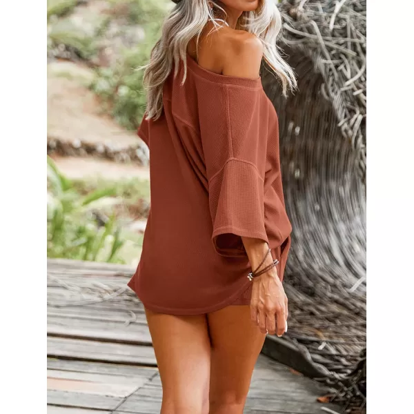 Ekouaer Womens 2 Piece Short Sleeve Waffle Knit Pajama Sets V Neck Off Shoulder Sleepwear Casual Loose Fit Sweatsuit Outfits(Caramel)