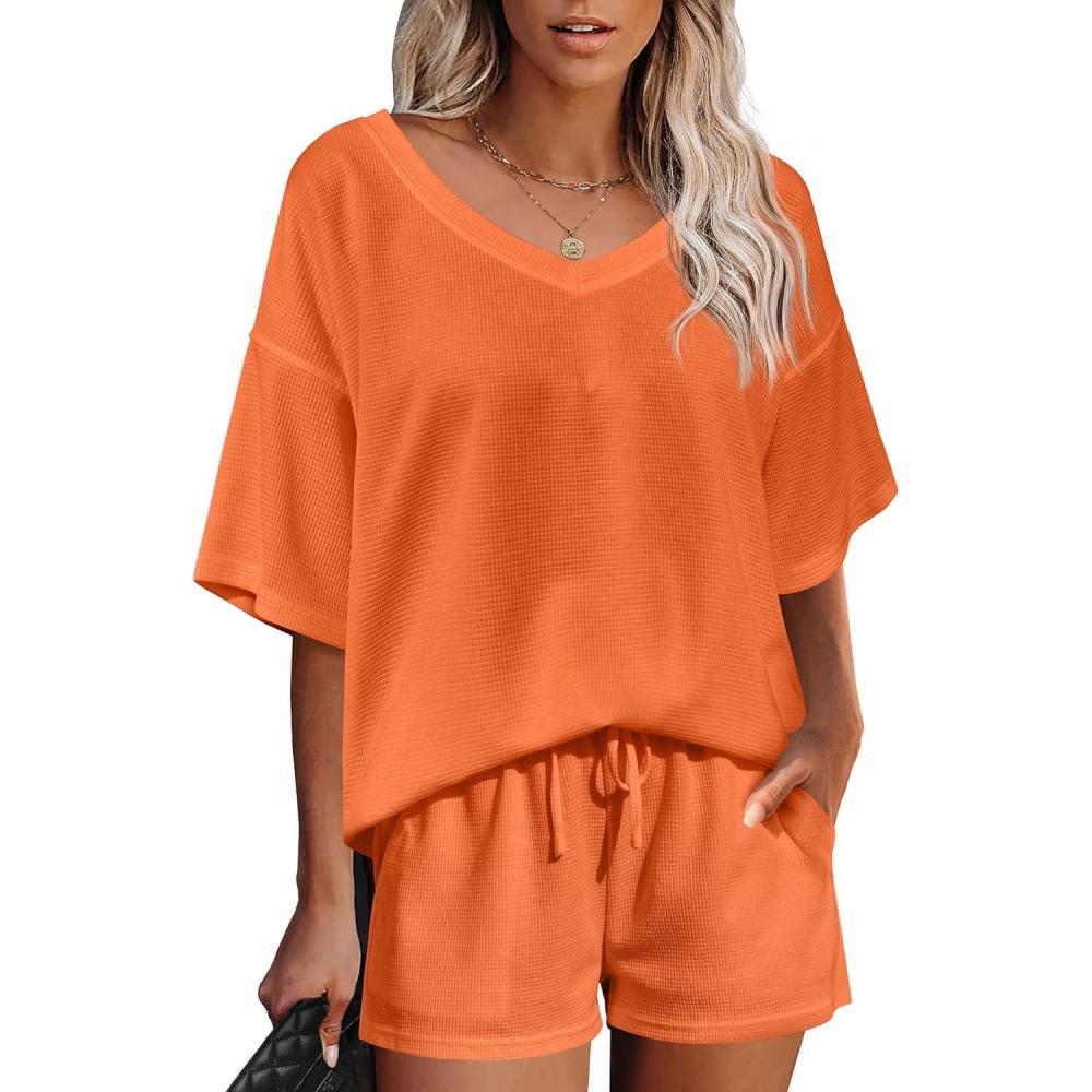 Ekouaer Womens 2 Piece Short Sleeve Waffle Knit V Neck Off Shoulder Casual Loose Fit Sweatsuit Outfits(Orange)