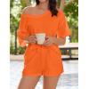 imageEkouaer Womens 2 Piece Short Sleeve Waffle Knit V Neck Off Shoulder Casual Loose Fit Sweatsuit OutfitsOrange