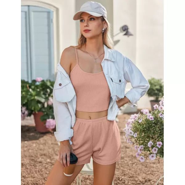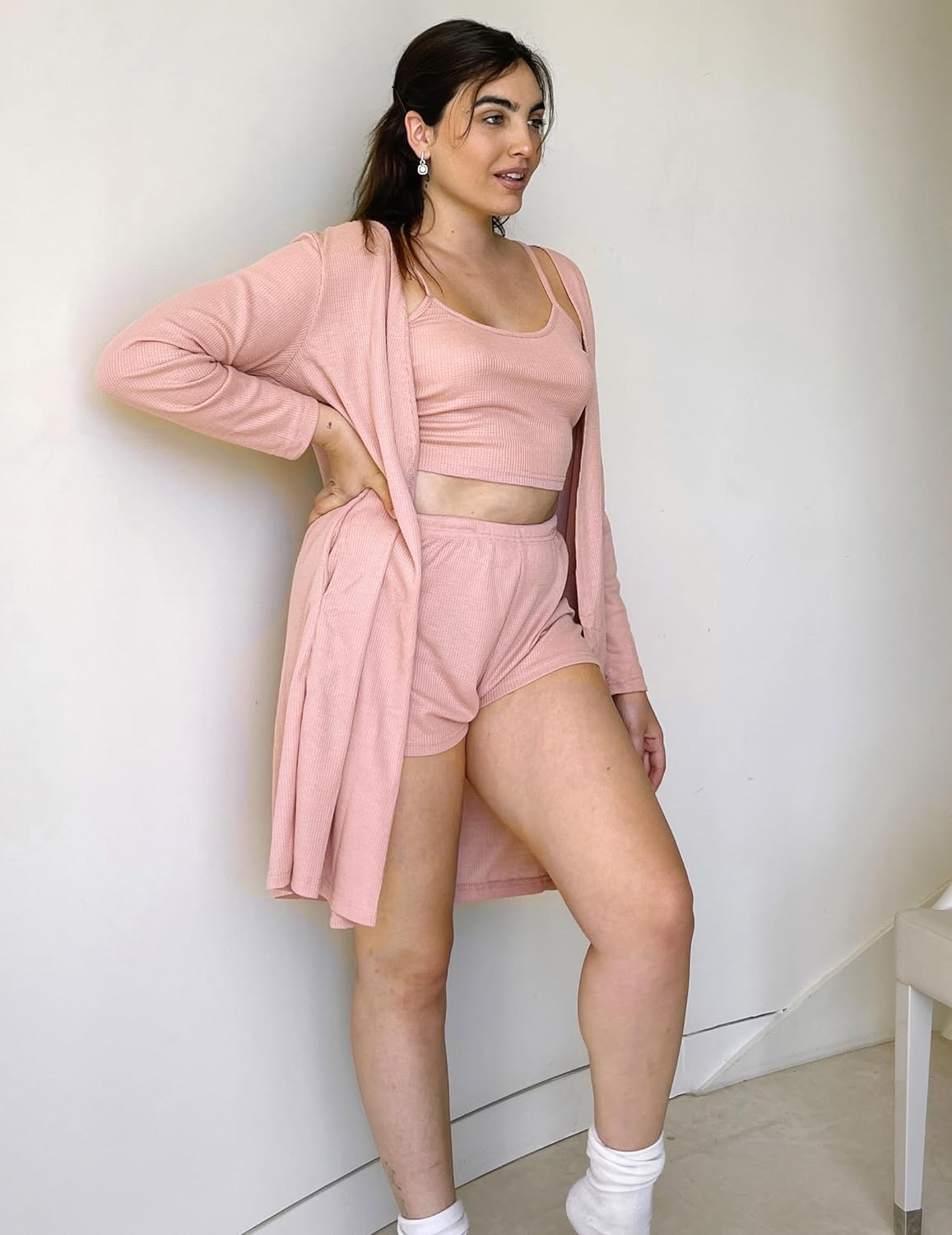 Ekouaer Womens 3 Piece Waffle Knit Lounge Set Soft Pajama Sets Tank Top and Shorts Loungewear Long Cardigan with pocket SXXLPink