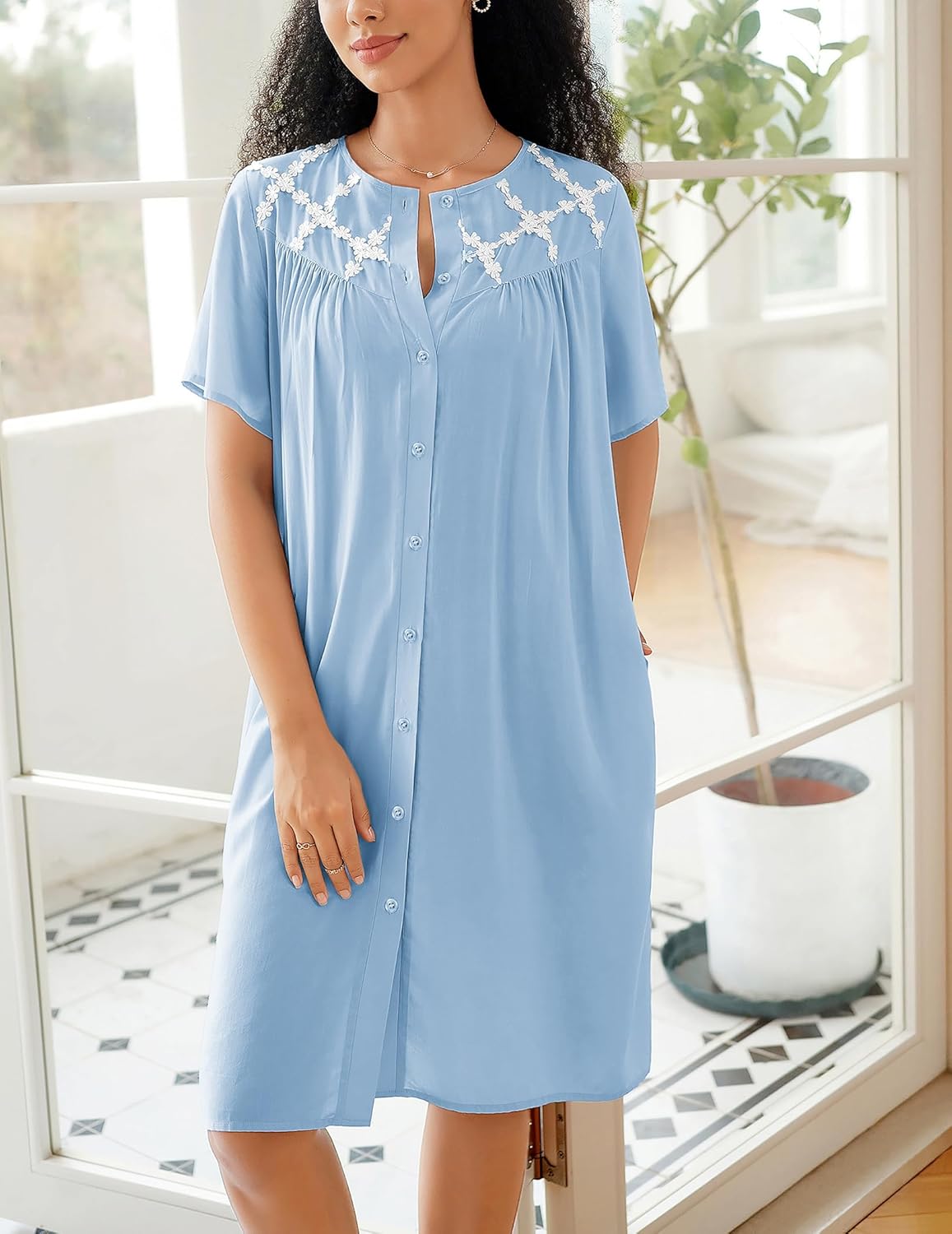 Ekouaer Women’s Button Down Nightgown Short Sleeve House Dress Short House Coat with Pockets S-4XL(Blue)
