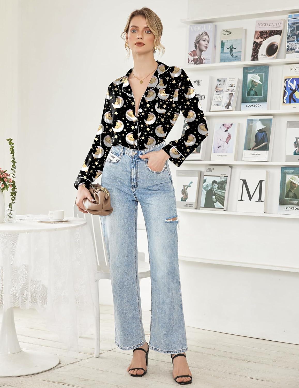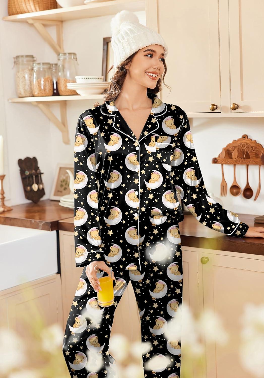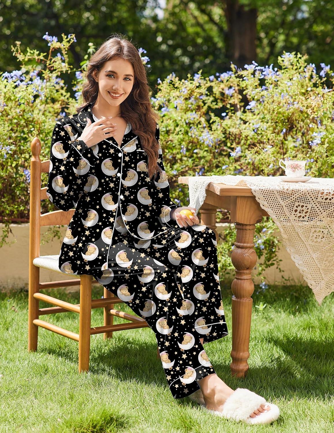 Ekouaer Women’s Classic Button Down Long Satin Silk Pajama Set(Black Teddy Moon)