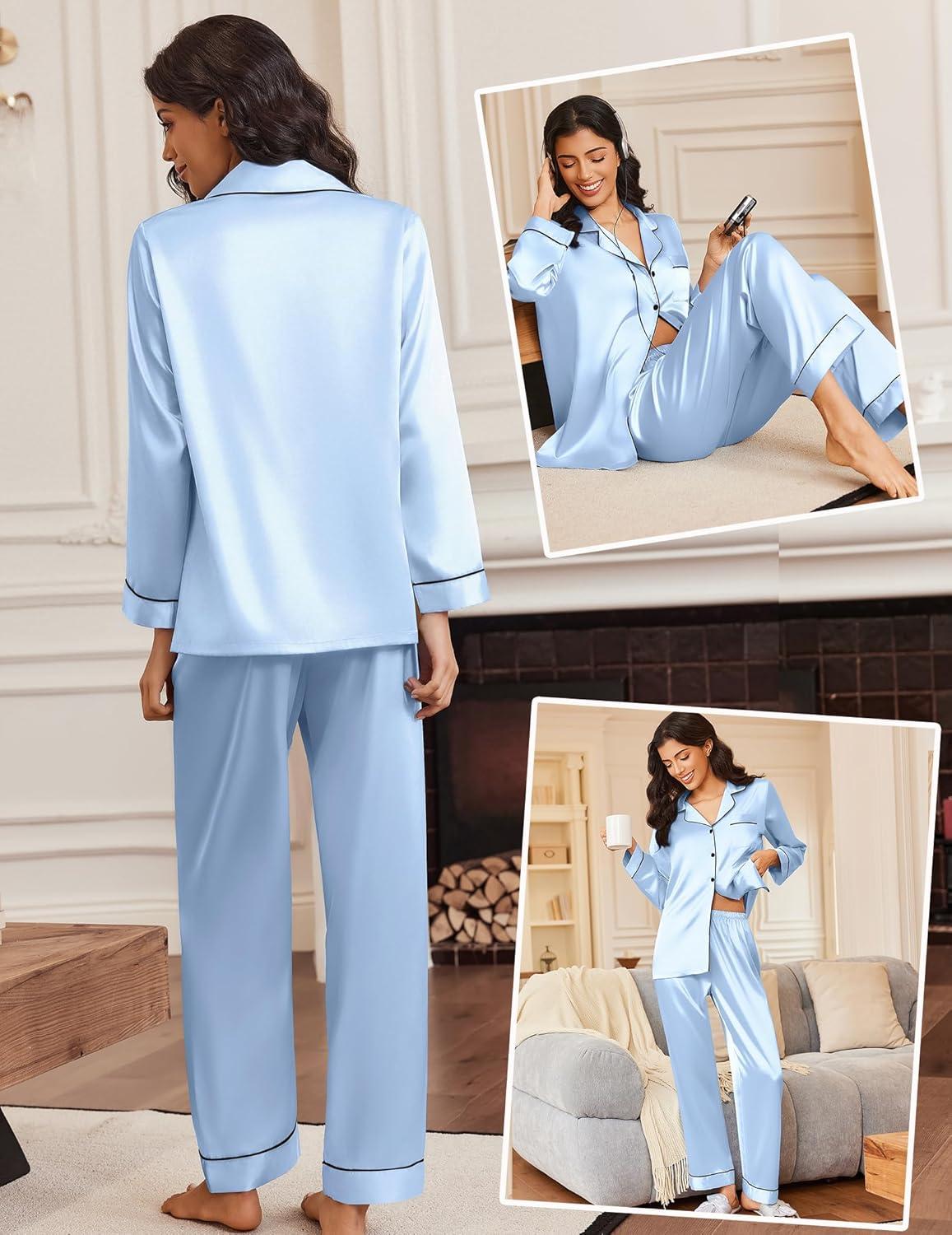 Ekouaer Women's Classic Button Down Long Satin Silk Pajama Set(Light Blue)