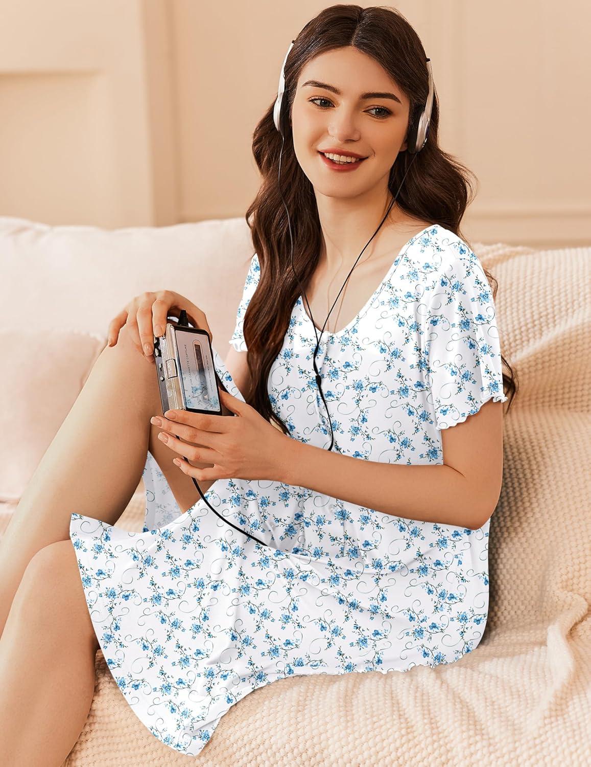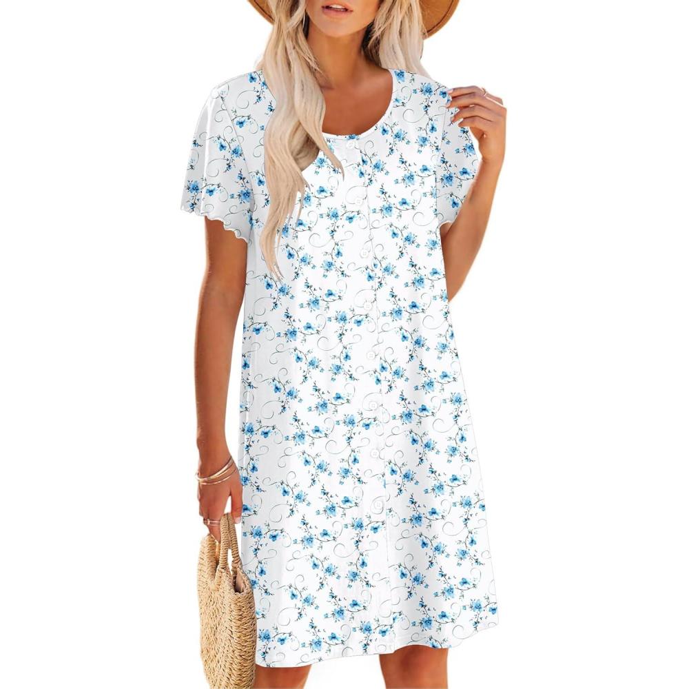 Ekouaer Womens’ Cotton Nightgown Ladies Short Sleeve Sleepshirt V Neck Button Down Night Gowns Casual House Dress(Blue Floral)
