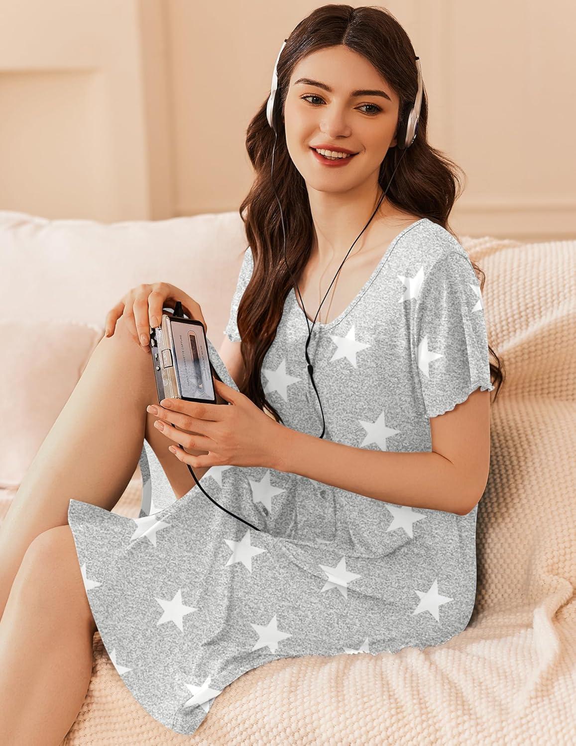 Ekouaer Womens' Cotton Nightgown Ladies Short Sleeve Sleepshirt V Neck Button Down Night Gowns Casual House Dress(Grey Star)