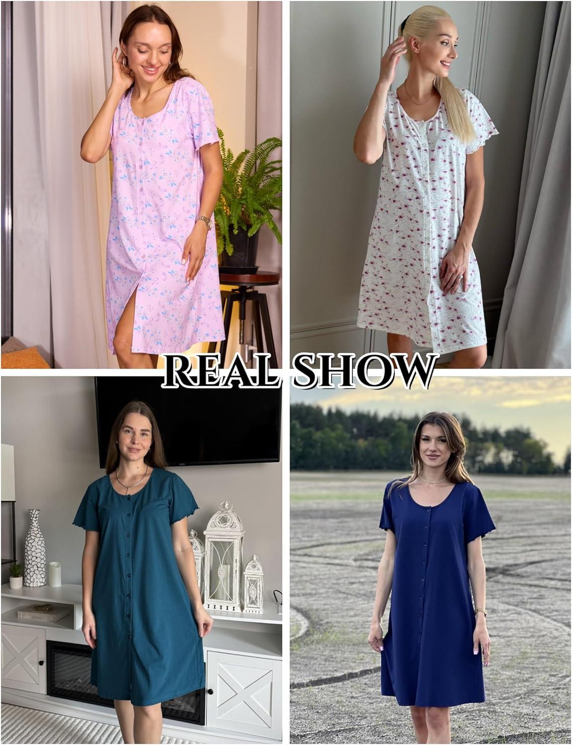 Ekouaer Womens’ Cotton Nightgown Ladies Short Sleeve Sleepshirt V Neck Button Down Night Gowns Casual House Dress(Blue Green)
