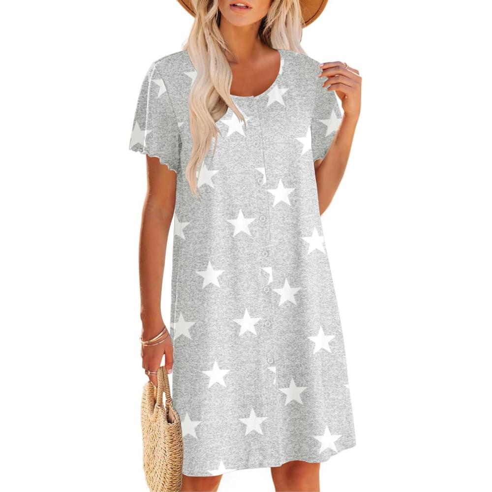 imageEkouaer Womens Cotton Nightgown Ladies Short Sleeve Sleepshirt V Neck Button Down Night Gowns Casual House DressGrey Star