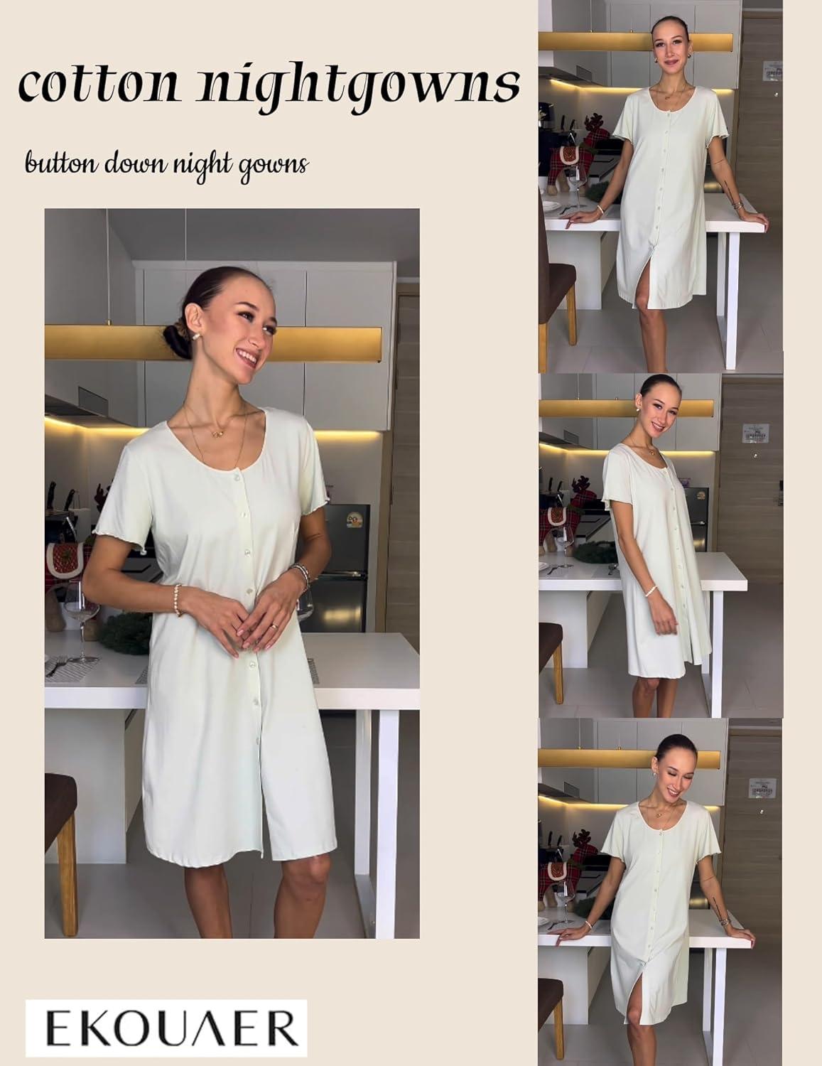 Ekouaer Womens’ Cotton Nightgown Ladies Short Sleeve Sleepshirt V Neck Button Down Night Gowns Casual House Dress(Light Grey)