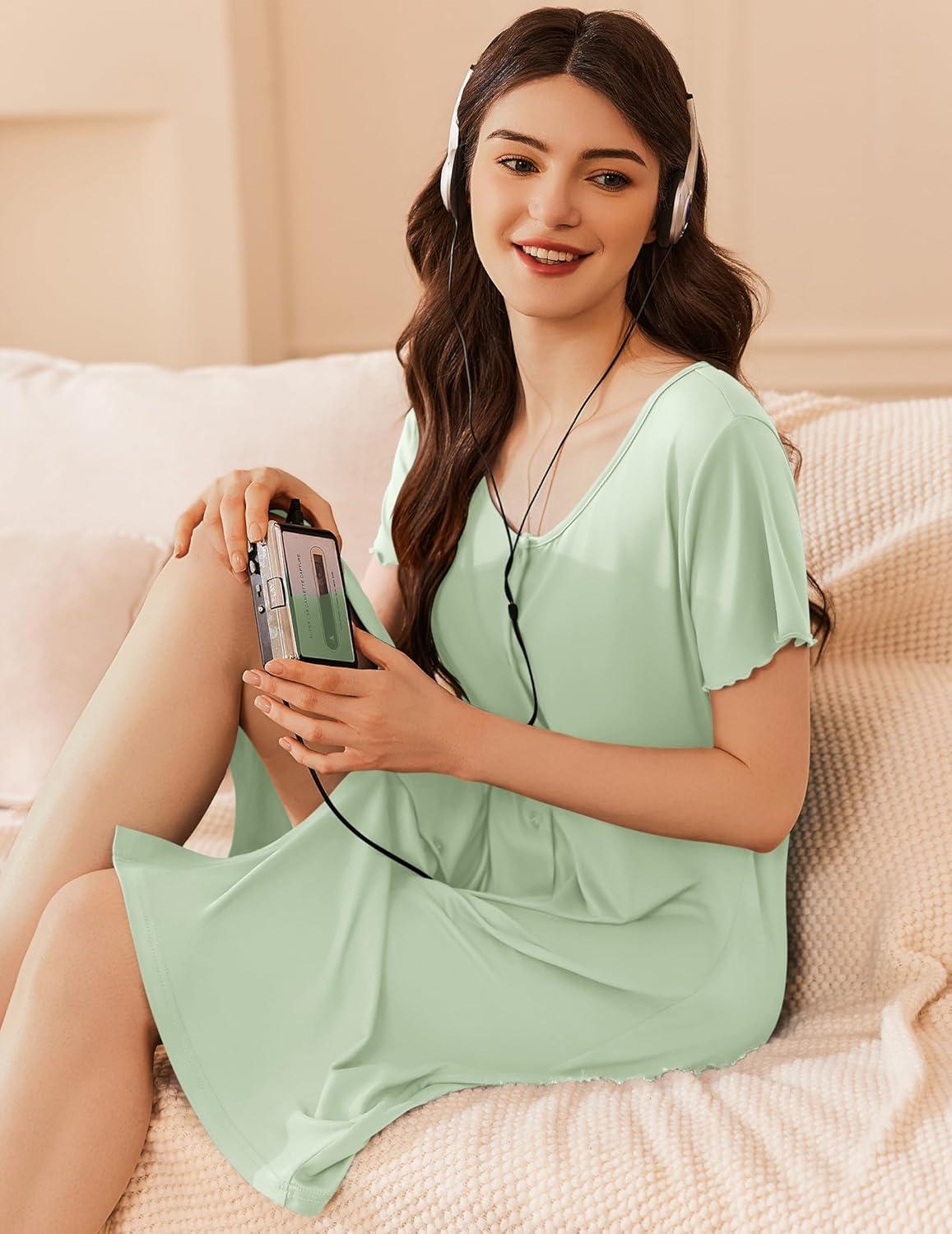Ekouaer Womens' Cotton Nightgown Ladies Short Sleeve Sleepshirt V Neck Button Down Night Gowns Casual House Dress(Light Green)