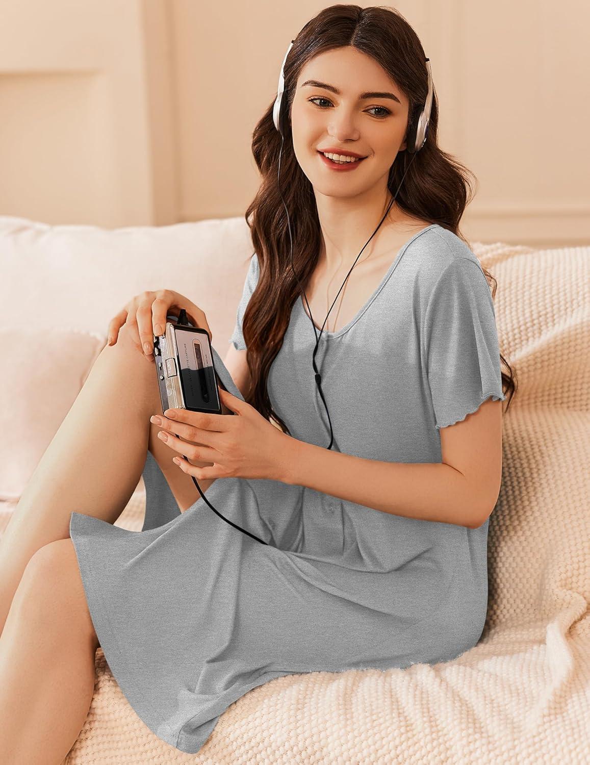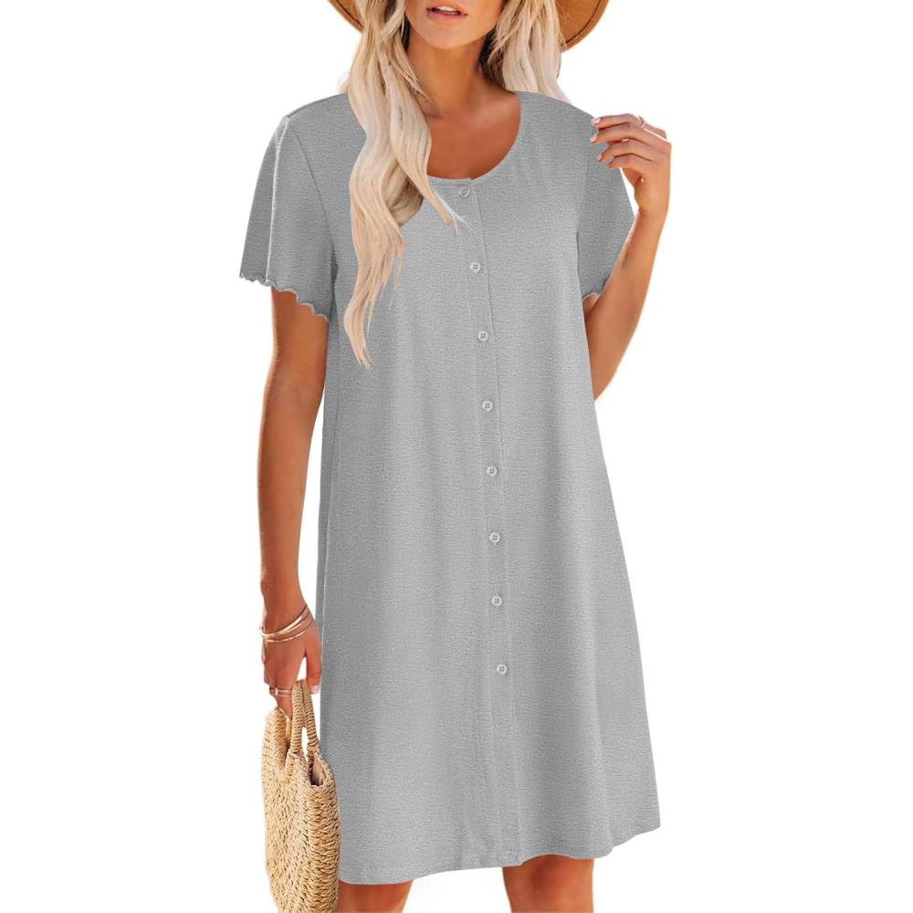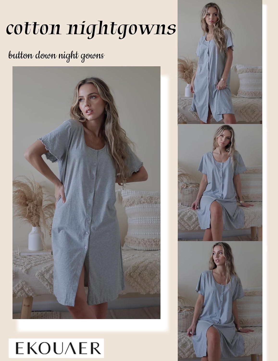 Ekouaer Womens' Cotton Nightgown Ladies Short Sleeve Sleepshirt V Neck Button Down Night Gowns Casual House Dress(Light Grey)