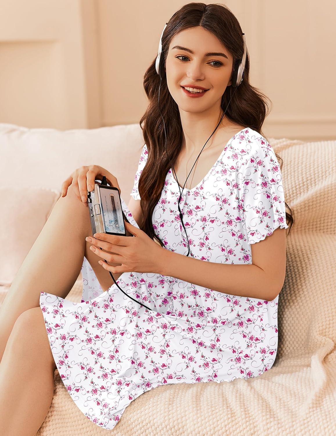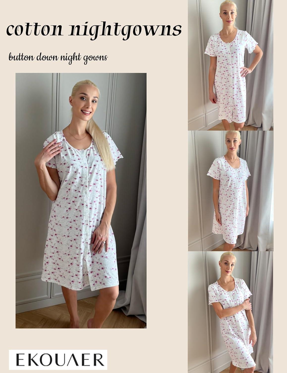 Ekouaer Womens' Cotton Nightgown Ladies Short Sleeve Sleepshirt V Neck Button Down Night Gowns Casual House Dress(Pink Floral)