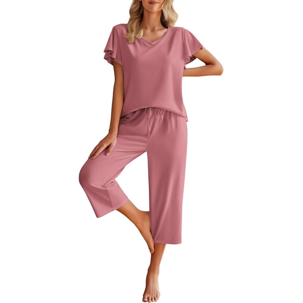 Ekouaer Womens Cotton Pajamas Sets Short Sleeve Tops and Capri Pants Sleepwear Loungewear with Pockets(Pale Violet Red)