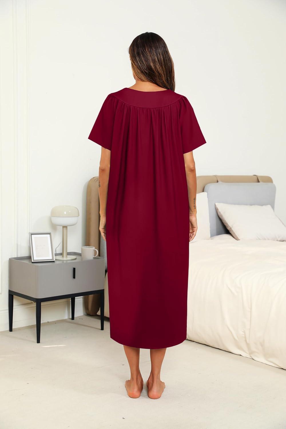 Ekouaer Women's House Dress with Pockets Long Nightgowns for Women House Dress Pleated Front Moo Moos for Women S-XXXL(Wine Red)