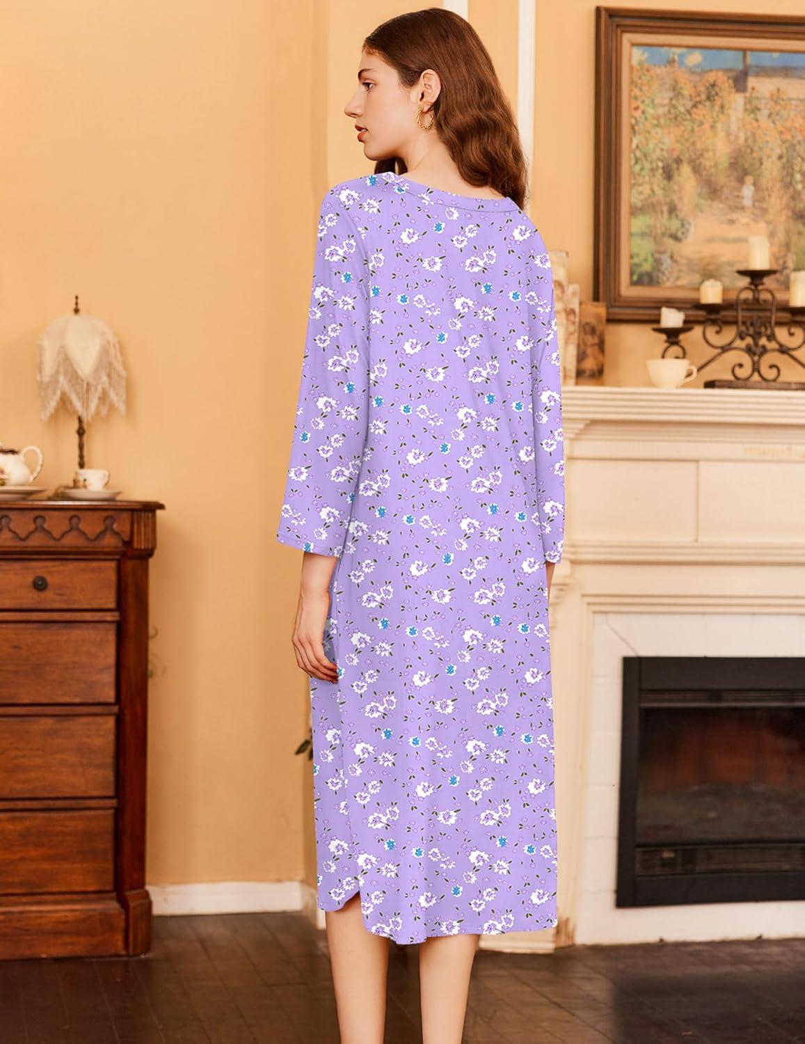 Ekouaer Womens Long Nightgowns Plaid Sleepwear Soft Loose Nightshirt 3/4 Sleeve Plus Size Housecoat with Button & Pockets(Purple Flowers)