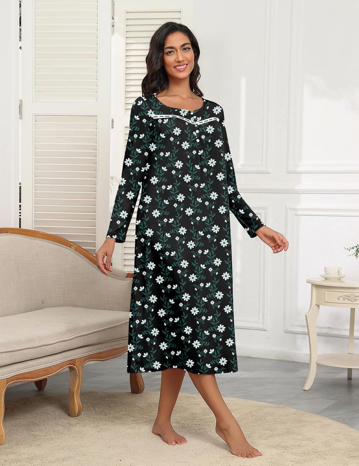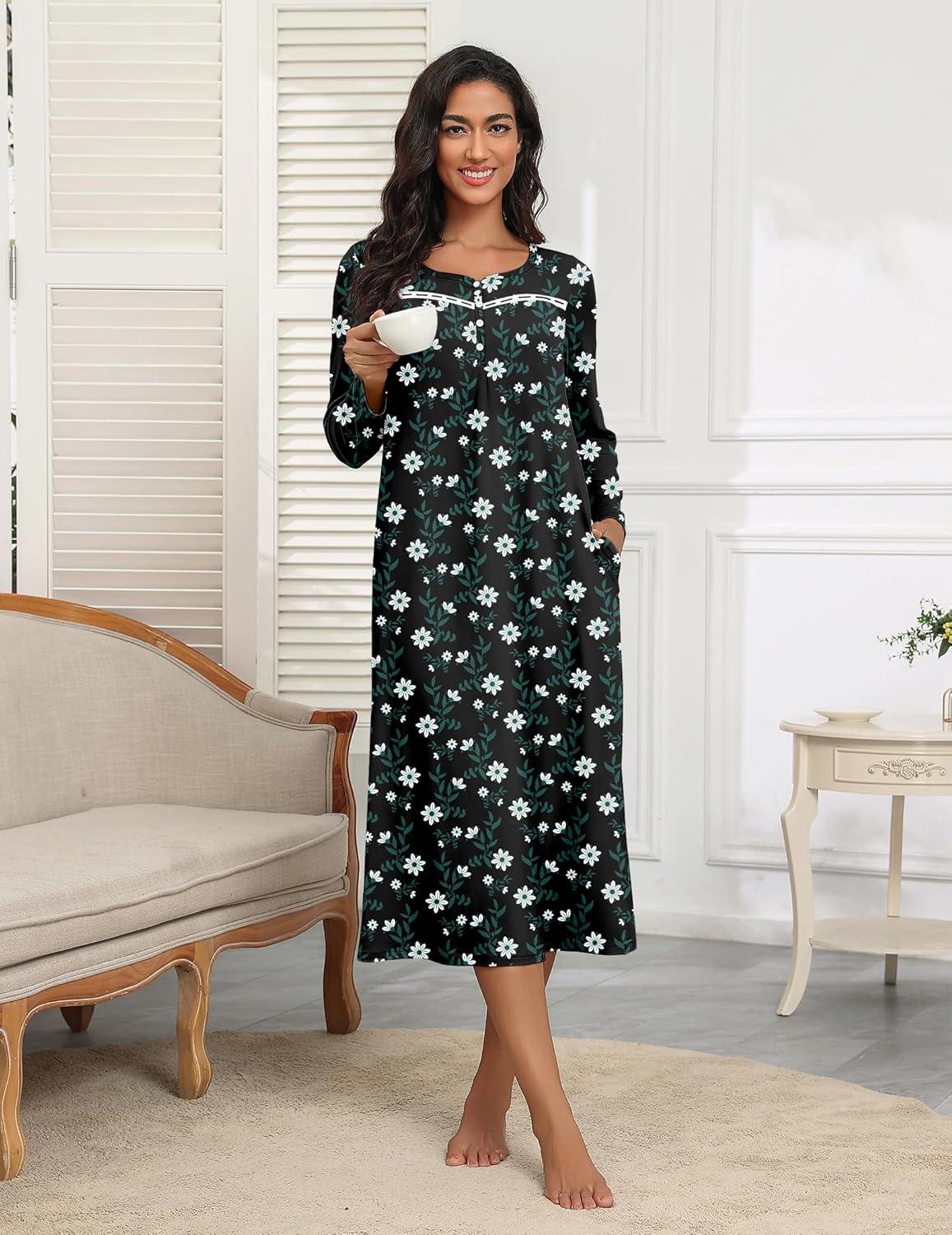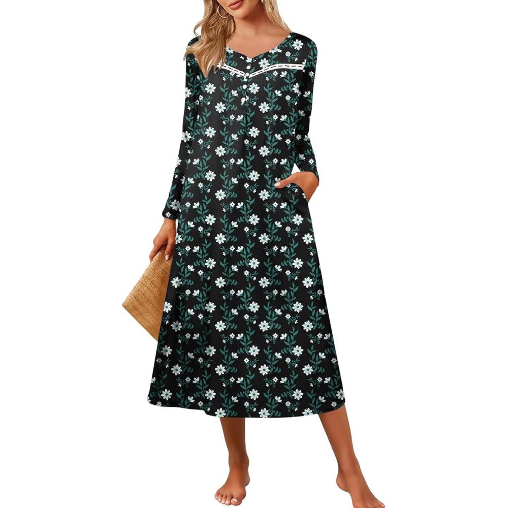 Ekouaer Women’s Long Sleeve Nightgown Full Length Pajama Dress with Pockets V Neck Nightshirts Lace Trim Sleepwear(Floral Green)