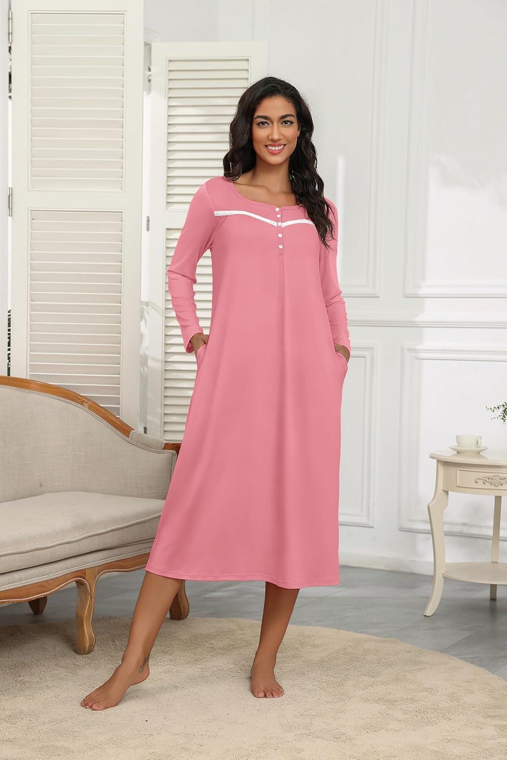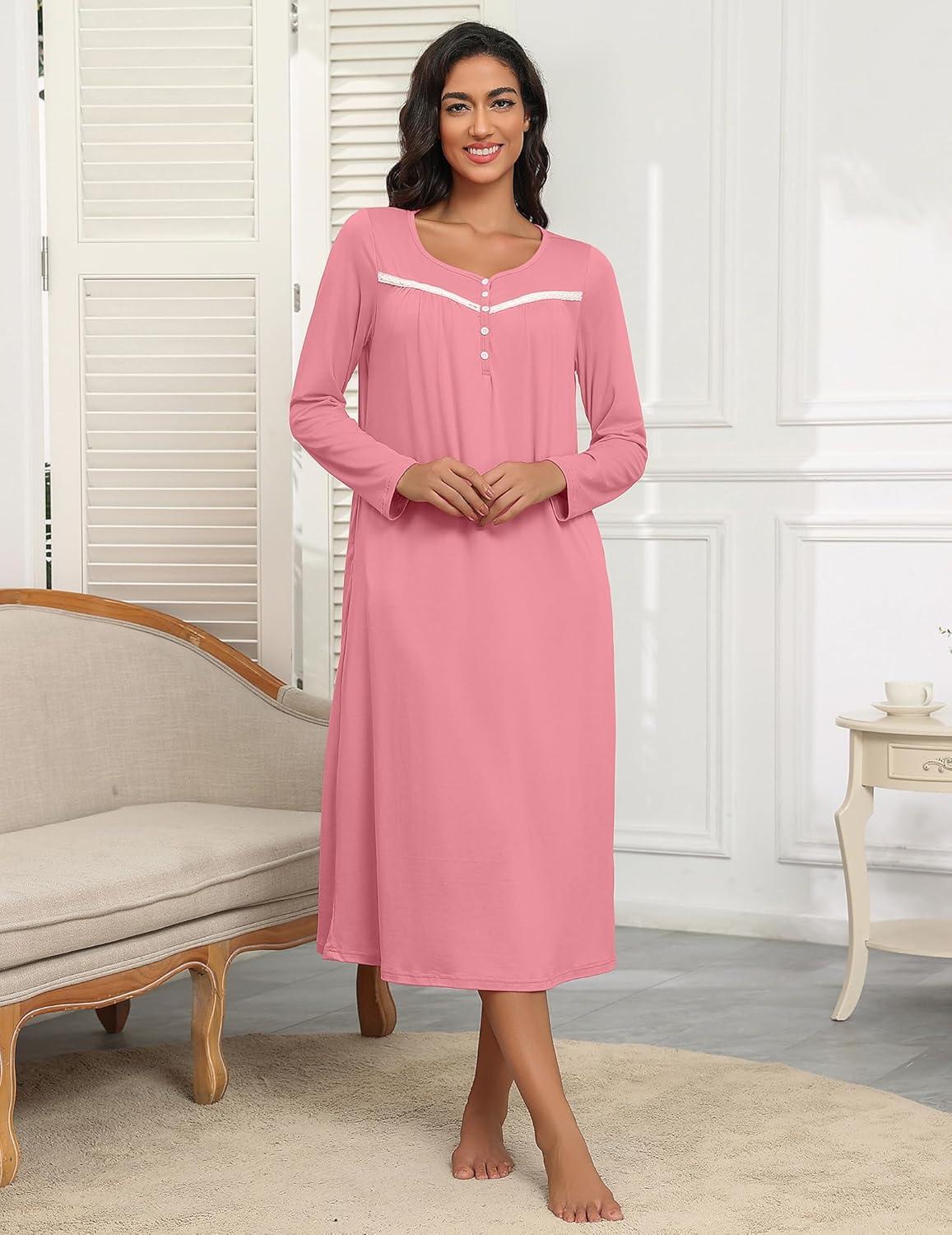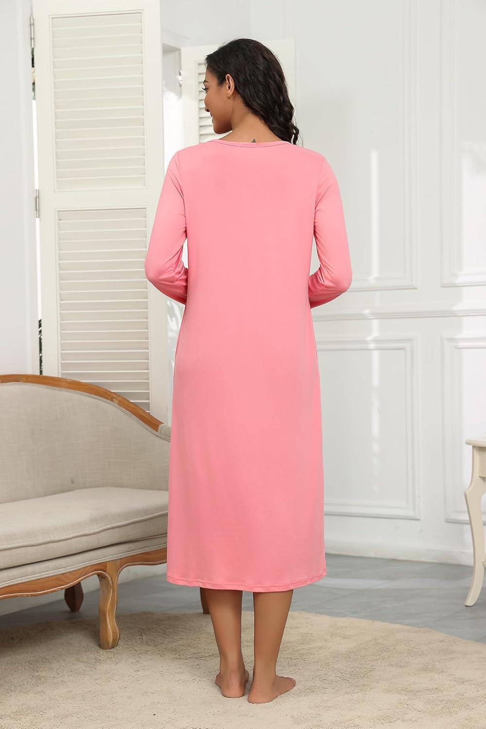 Ekouaer Women’s Long Sleeve Nightgown Full Length Pajama Dress with Pockets V Neck Nightshirts Lace Trim Sleepwear(Pink)