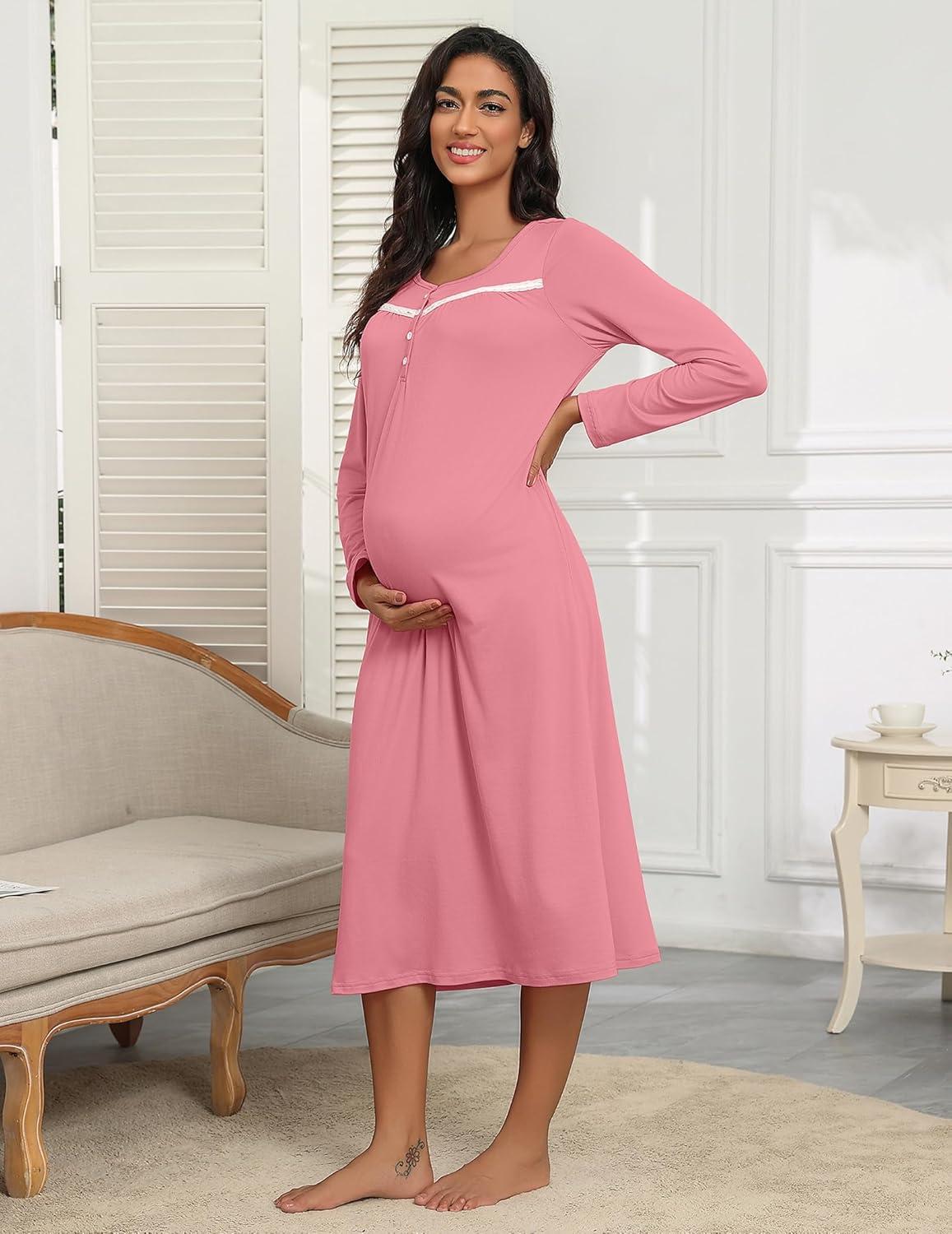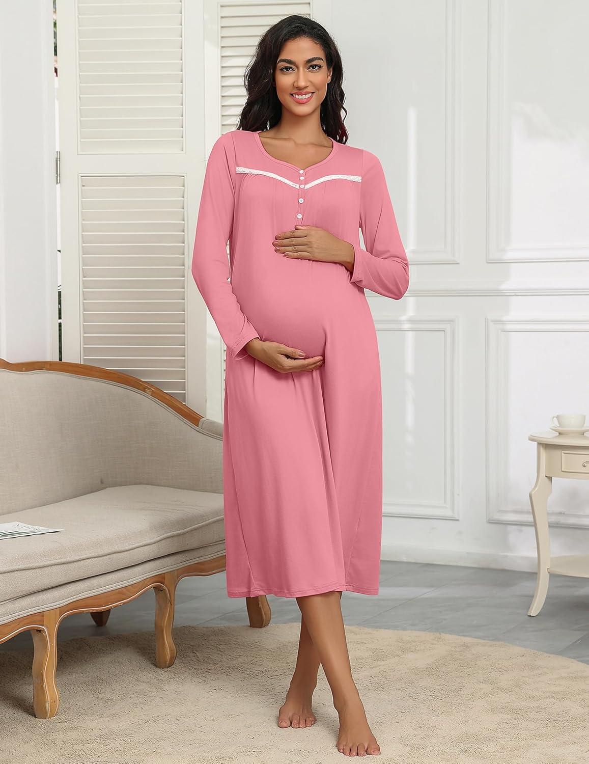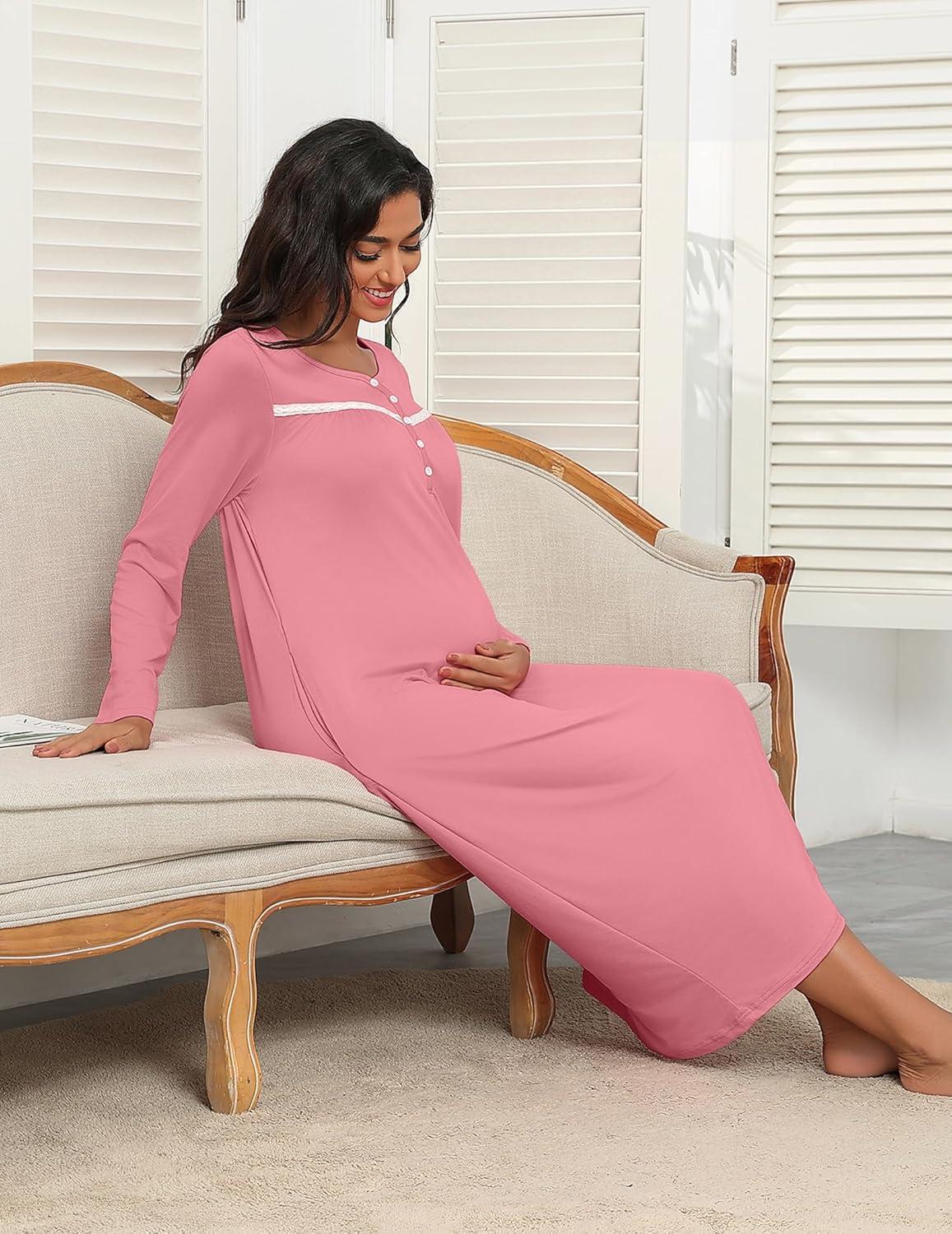 Ekouaer Women’s Long Sleeve Nightgown Full Length Pajama Dress with Pockets V Neck Nightshirts Lace Trim Sleepwear(Pink)