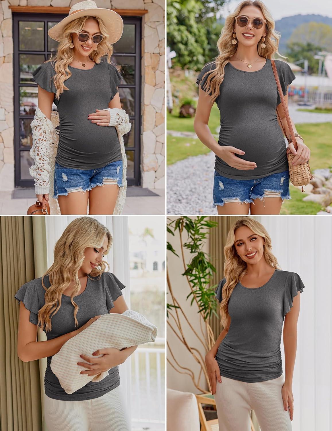 Ekouaer Women’s Maternity Shirts 3 Packs Flying Short Sleeve Pregnancy Tops Side Ruched Tunic Blouse Mama Clothes S-XXL(Dark Grey / Black / Light Grey(3pcs))
