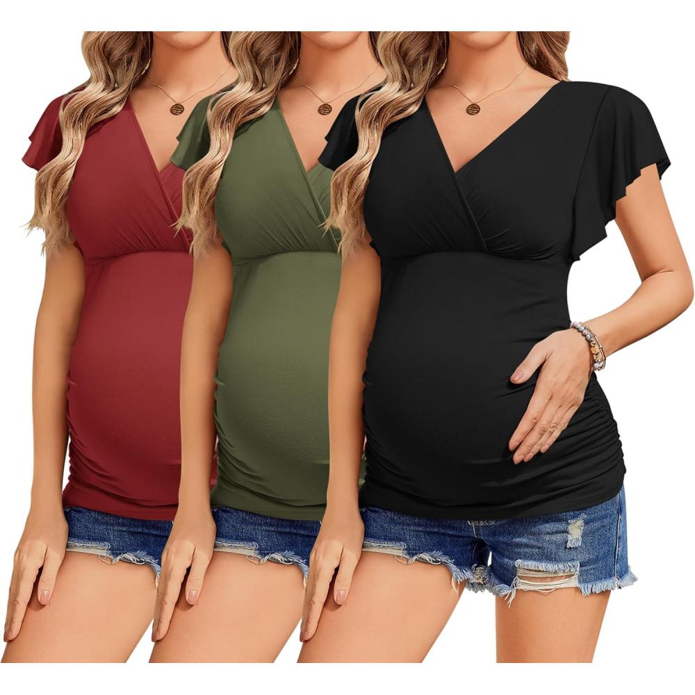 Ekouaer Women's Maternity Shirts 3 Packs Nursing Tops Flying Short Sleeve Breastfeeding Tees Side Ruched Pregnancy Clothes(Wine Red / Army Green / Black(3pcs))