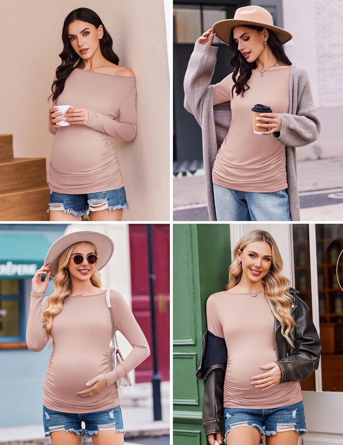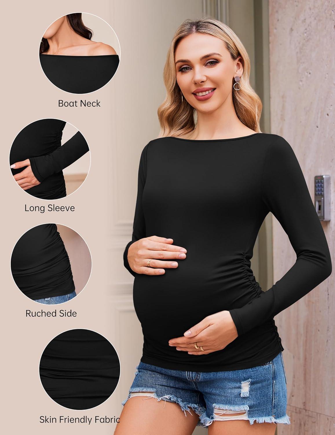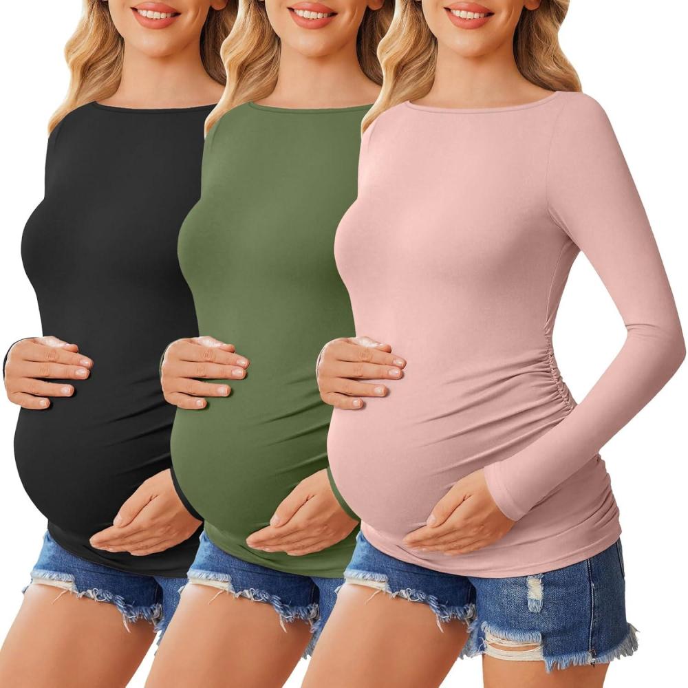 Ekouaer Womens Maternity Shirts Boat Neck 3 Packs Pregnancy Tops Long Sleeve Tunic Tees Casual Blouse New Mama Clothes S-XXL(Black/Dirty Pink/Army Green)