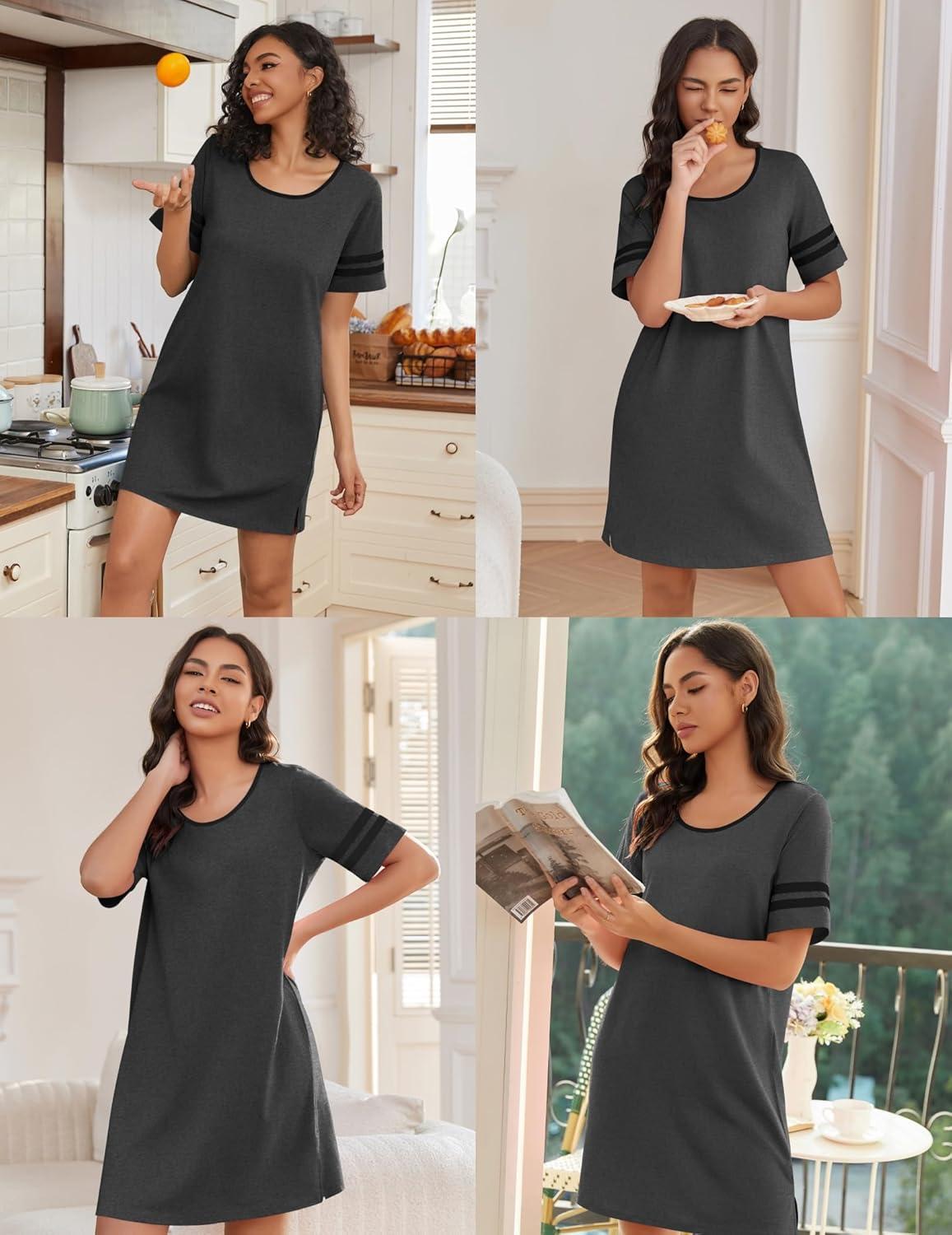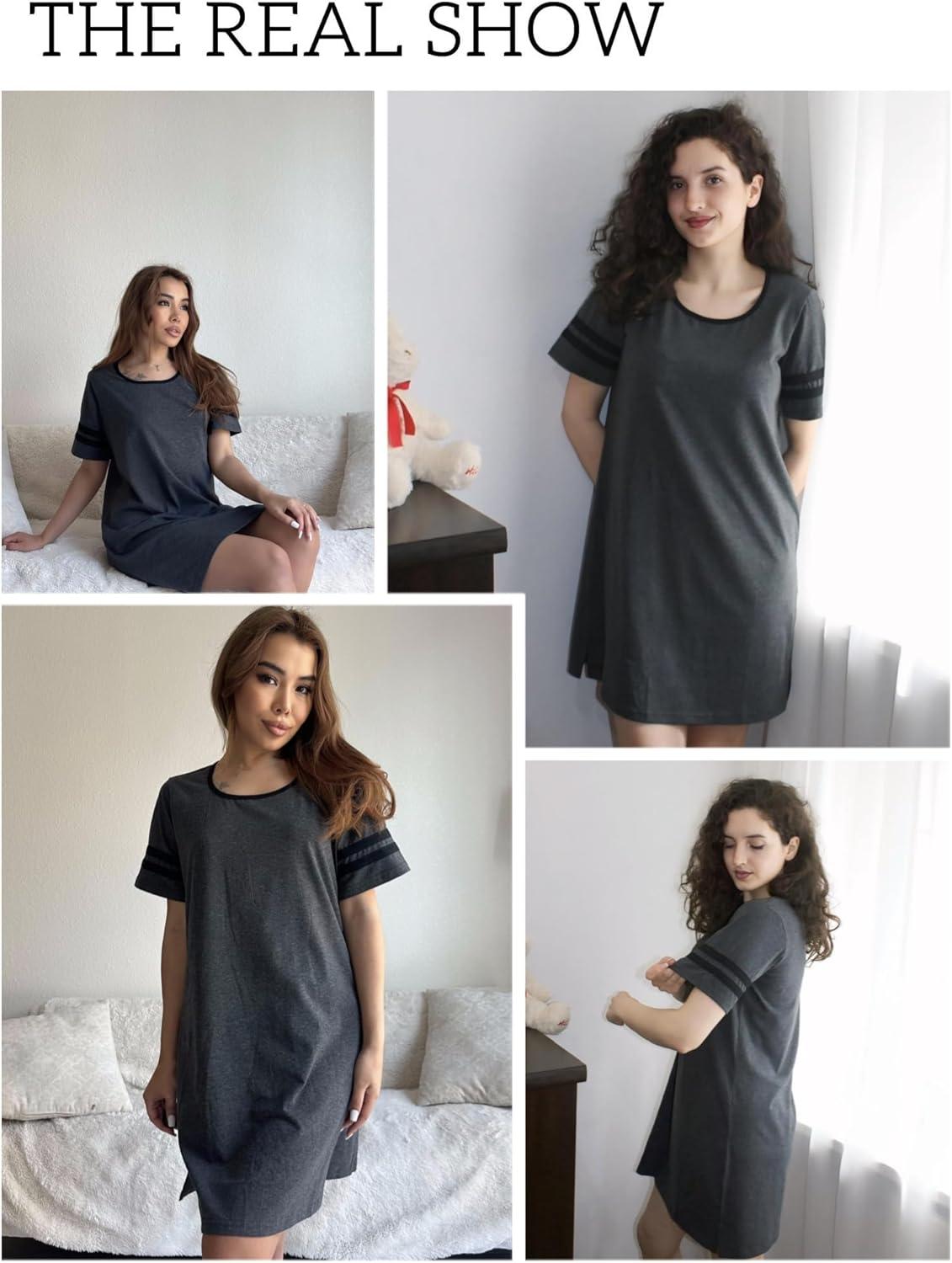 Ekouaer Womens Nightgowns Short Sleeve Cotton Sleepwear Crew Neck Loungewear Color Block Nightshirt Summer Dresses(Dark Grey)