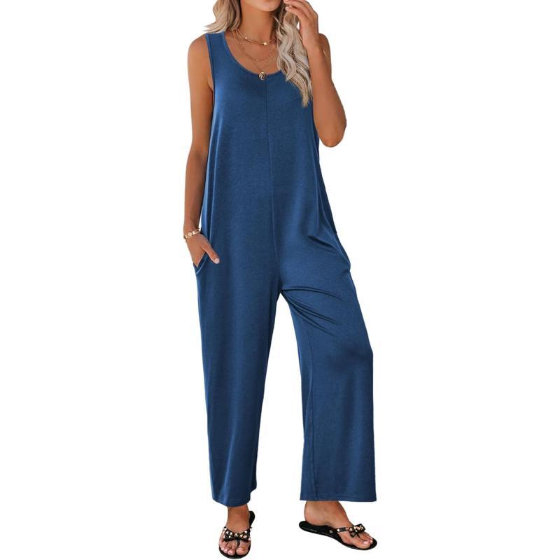 Ekouaer Womens Onesies Pajamas Scoop Neck Tank Jumpsuits Casual Wide Leg Loose Rompers with Pockets(Navy)