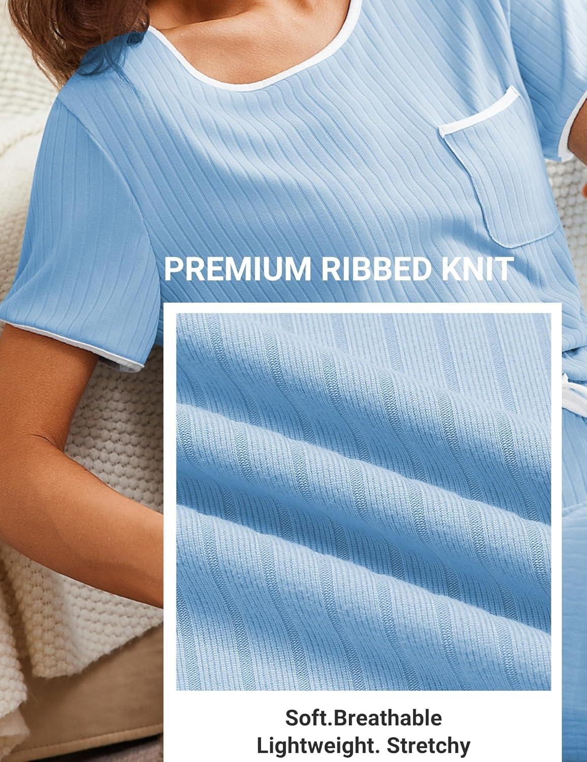 Ekouaer Womens Pajama Set Ribbed Knit Soft Shorts Pjs Summer Sleepwear Two Piece Casual Lounge Sets with Drawstring & Pockets(Clear Blue)