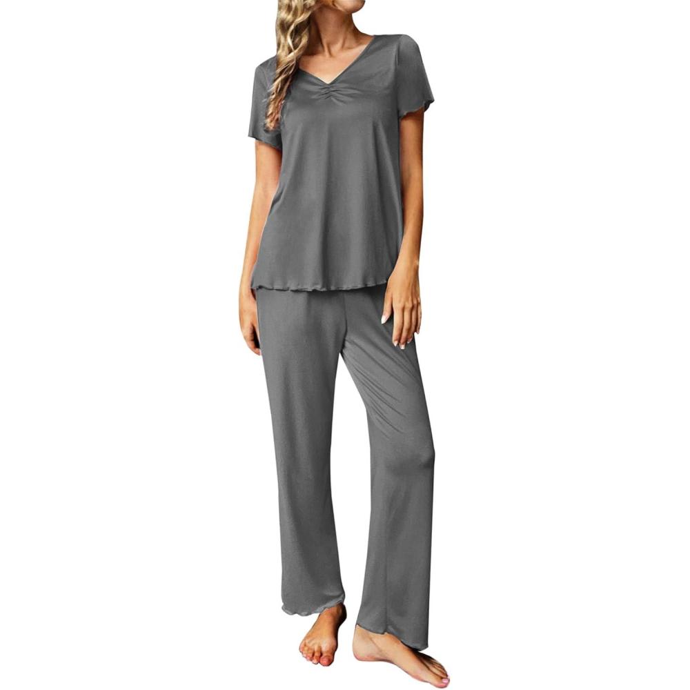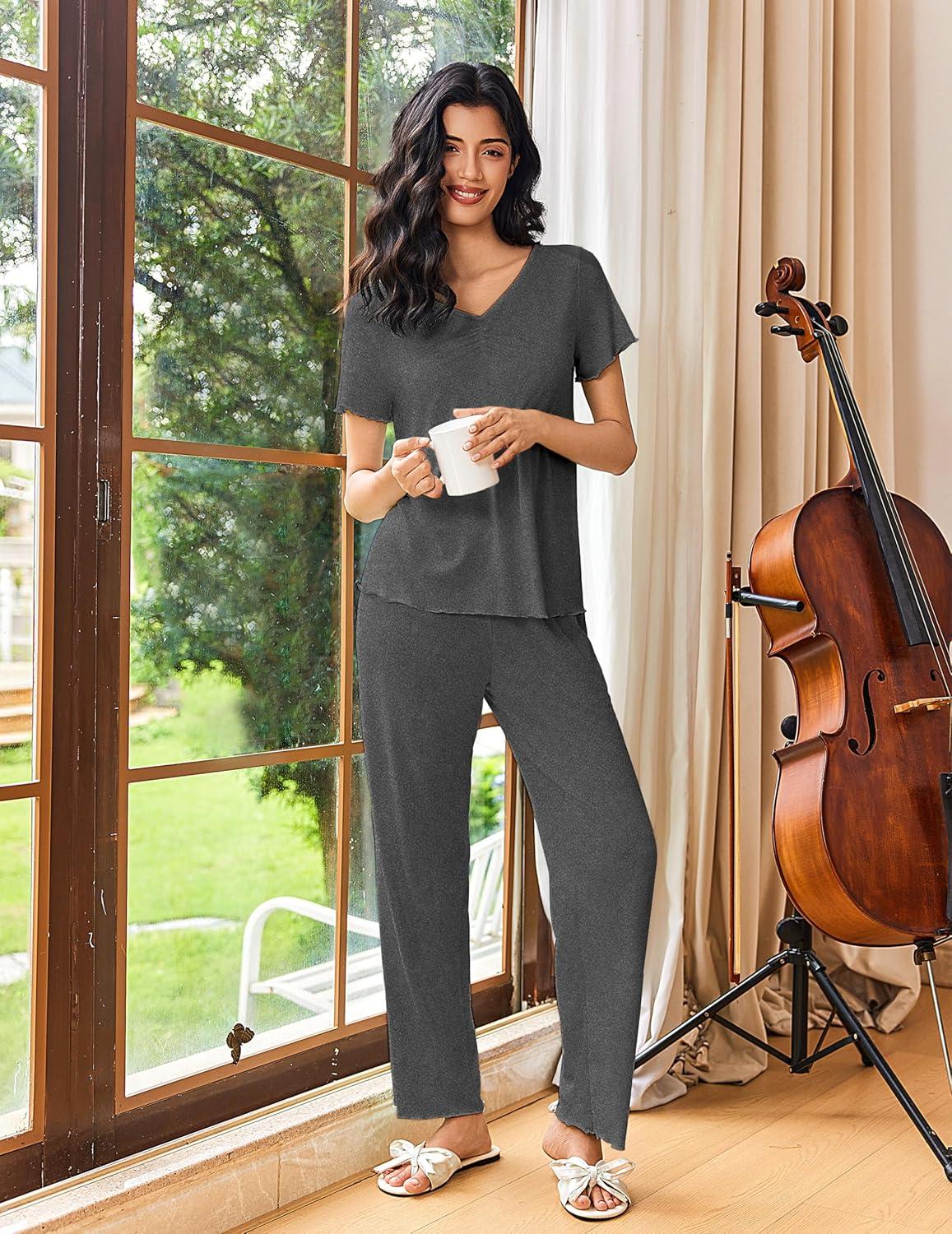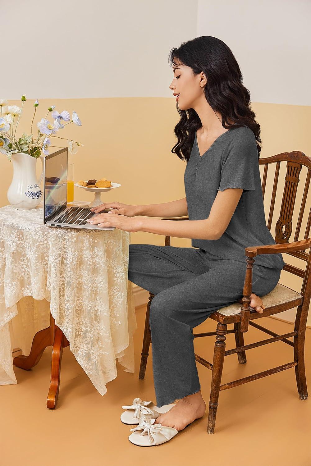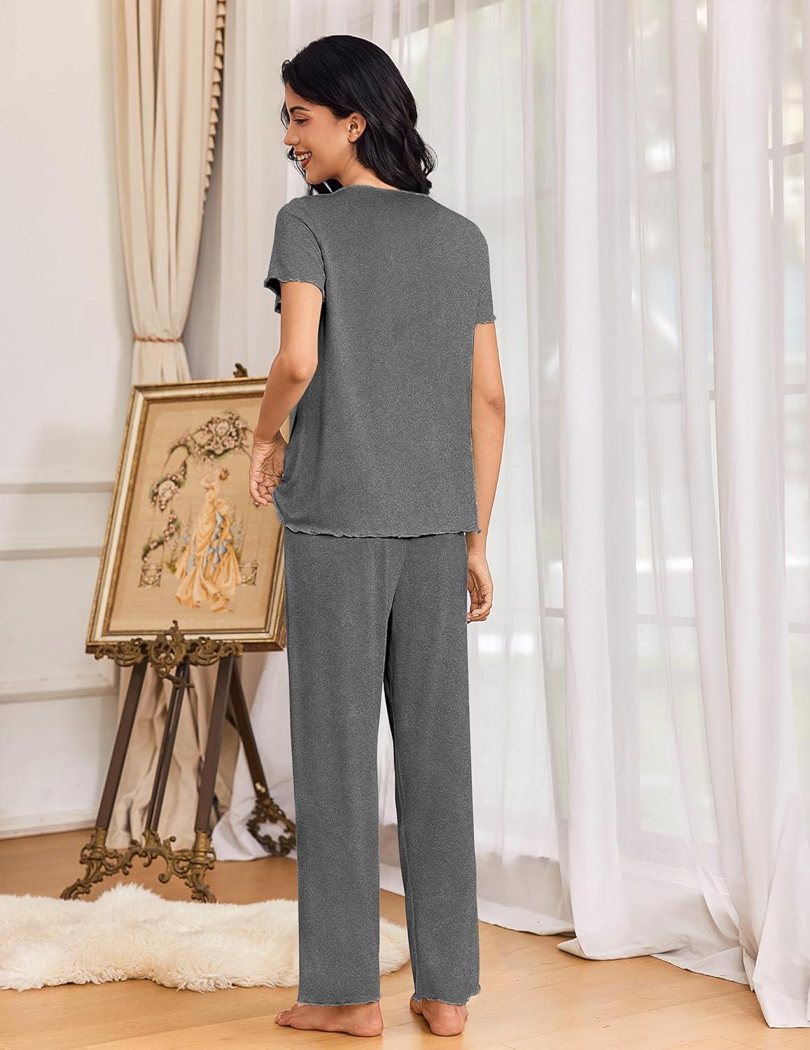 Ekouaer Womens Pajama Sets 2 Piece Lounge Set Soft Pajamas for Women Set Short Sleeve and Long Pants Pjs with Pockets(Deep Grey)