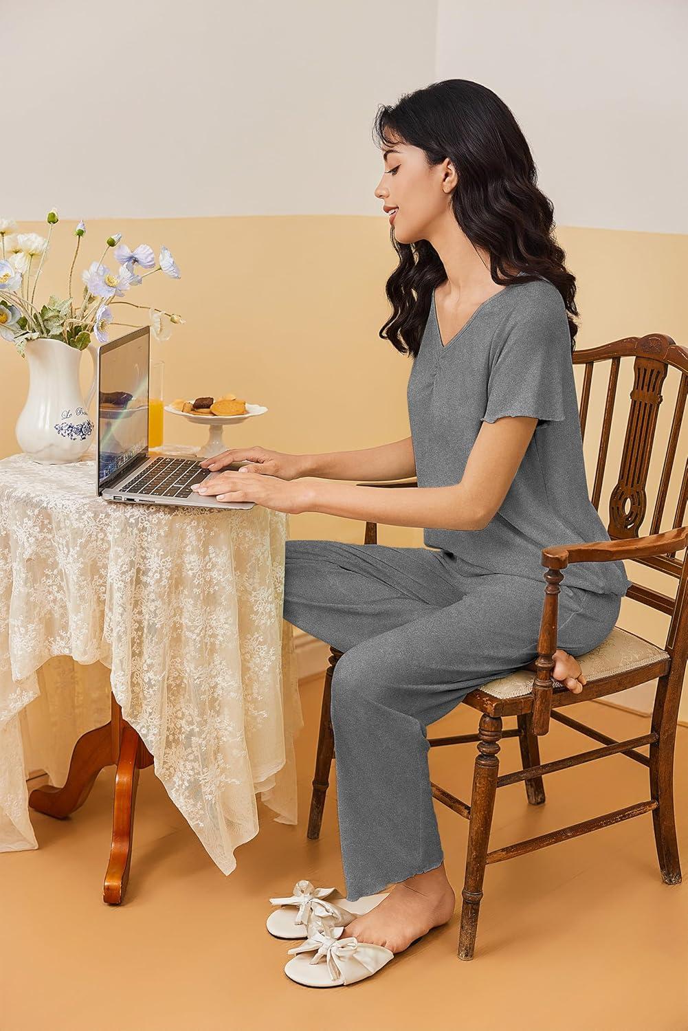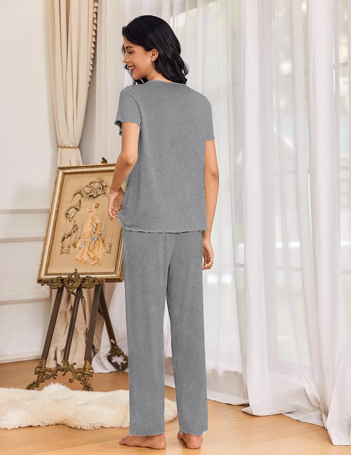 Ekouaer Womens Pajama Sets 2 Piece Lounge Set Soft Pajamas for Women Set Short Sleeve and Long Pants Pjs with Pockets(Grey)