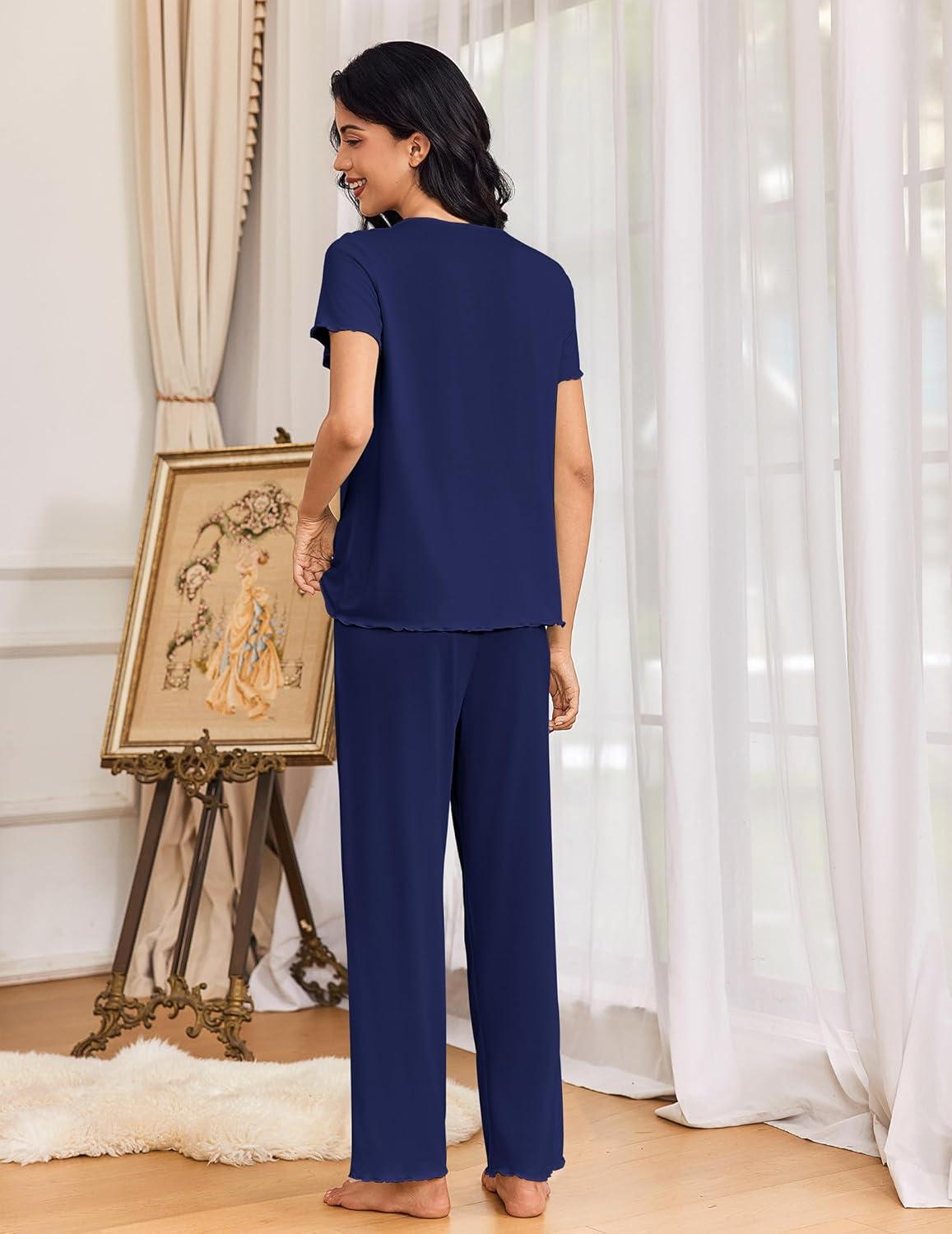 Ekouaer Womens Pajama Sets 2 Piece Lounge Set Soft Pajamas for Women Set Short Sleeve and Long Pants Pjs with Pockets(Navy Blue)