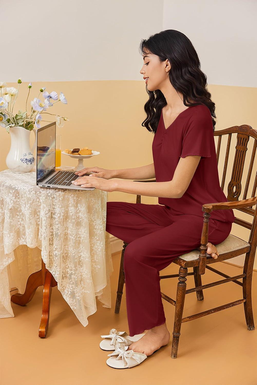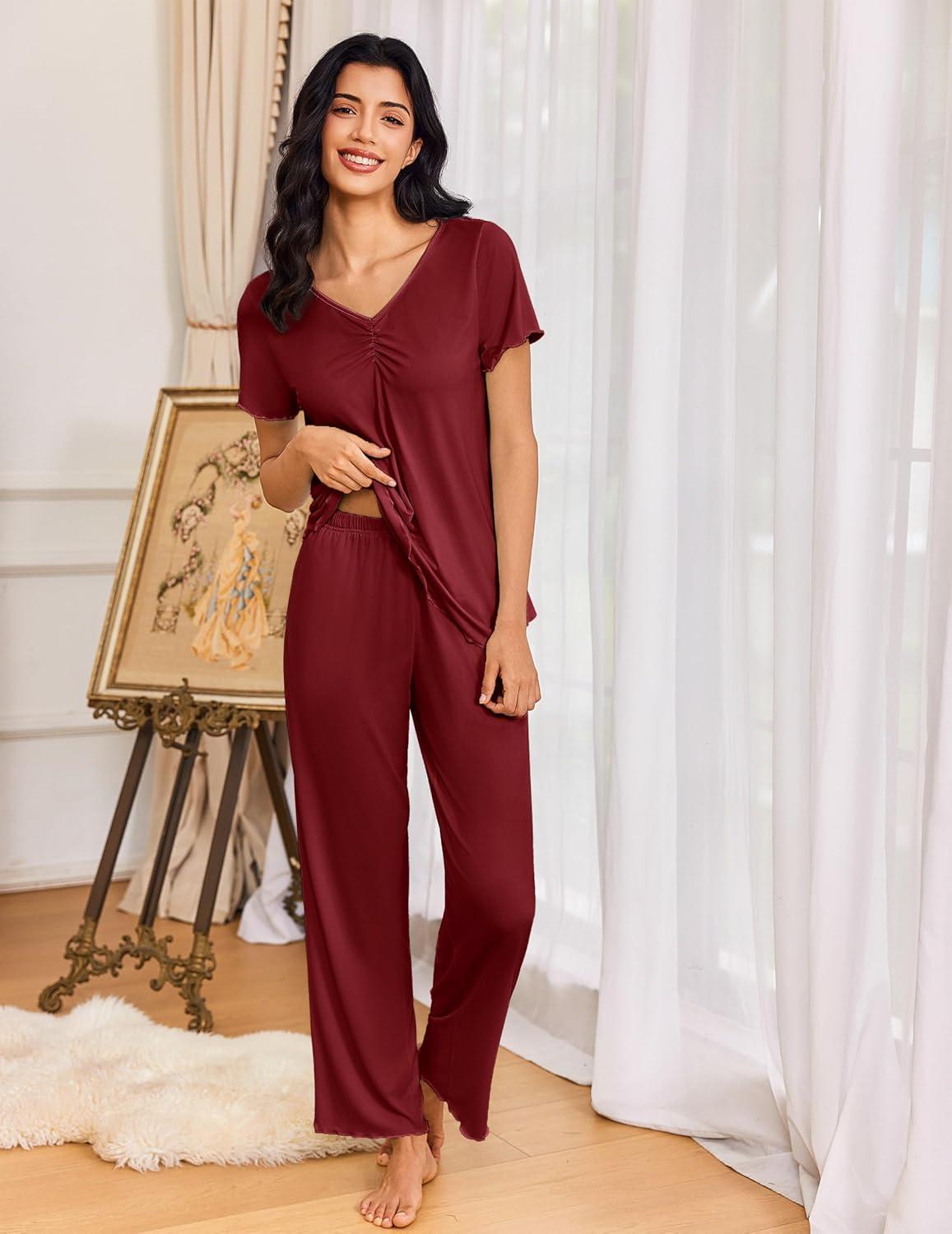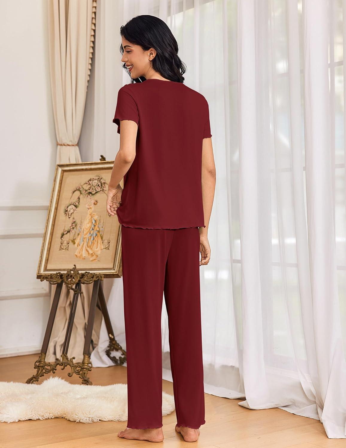 imageEkouaer Womens Pajama Sets 2 Piece Lounge Set Soft Pajamas for Women Set Short Sleeve and Long Pants Pjs with PocketsRed