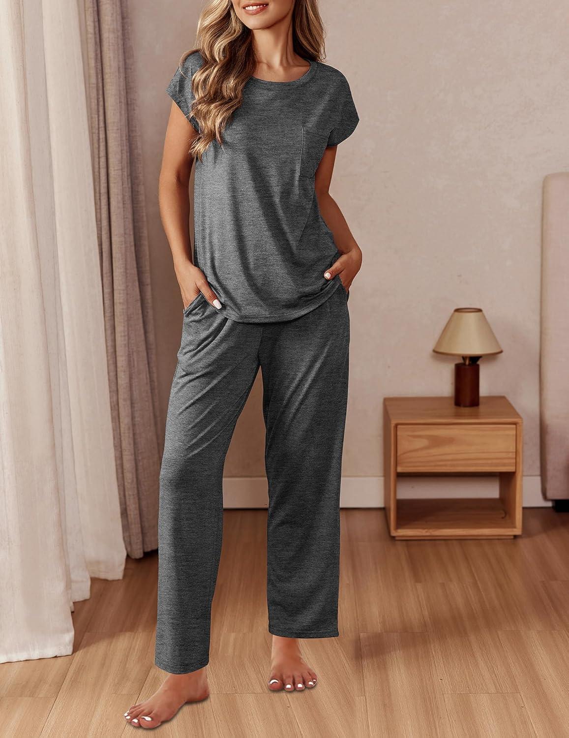 Ekouaer Womens Pajama Sets Cap Sleeve Sleepwear Tops and Long Pants Comfy Pjs 2 Piece Lounge Set with Pockets S-XXL(Dark Grey)