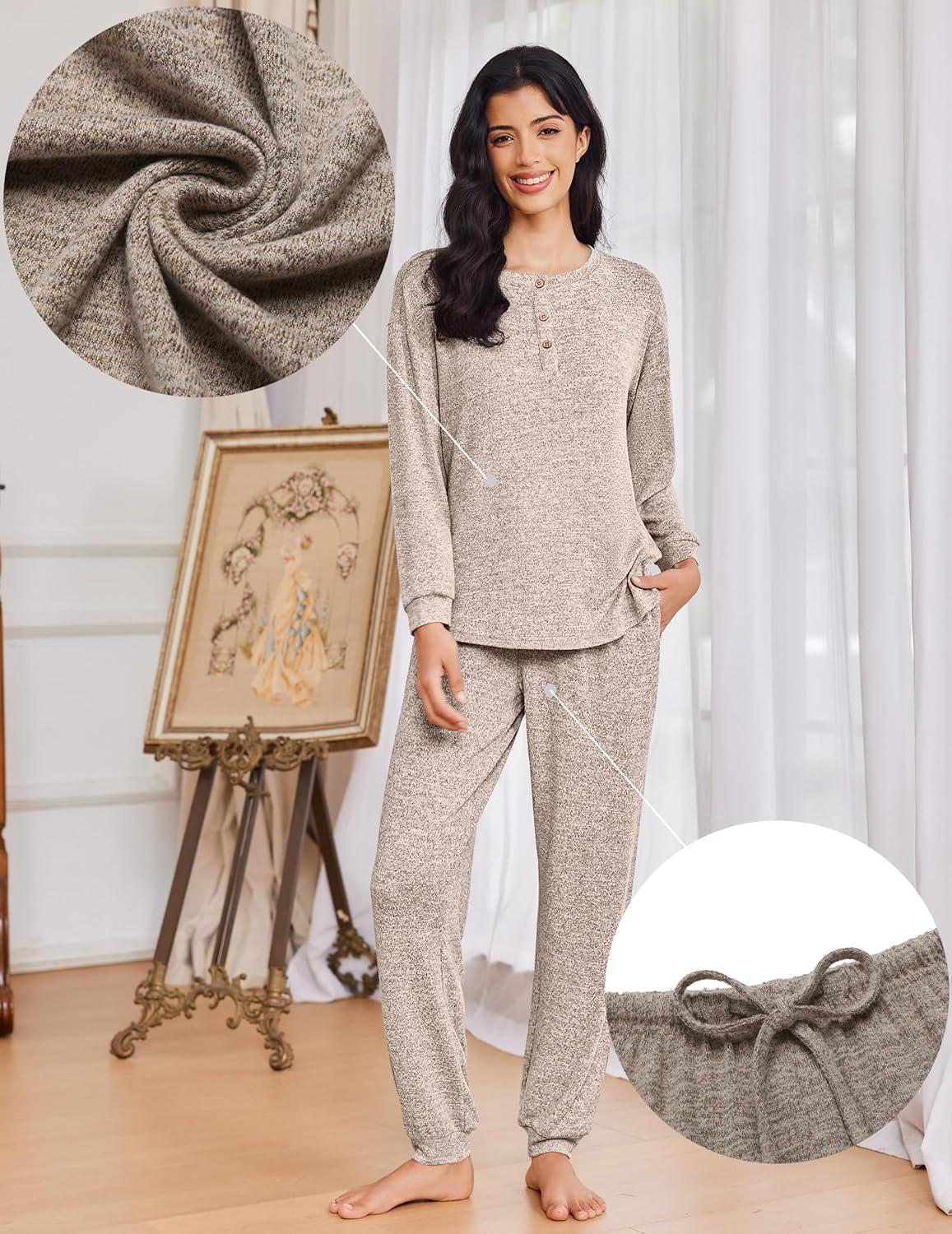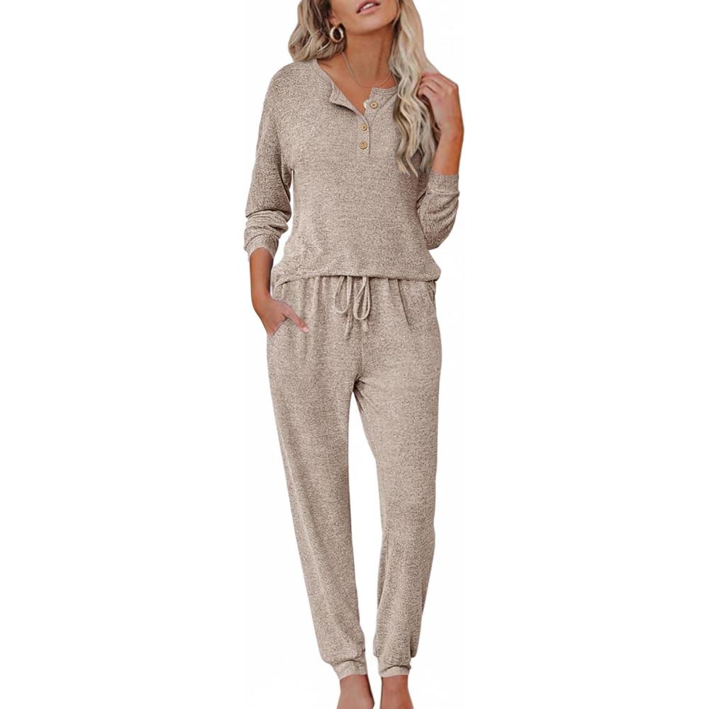 Ekouaer Womens Pajama Sets Long Sleeve Lounge Set 2 Piece Pj Sets for Women Henley Neck Casual Sleepwear Loungewear S-XXL(Khaki)
