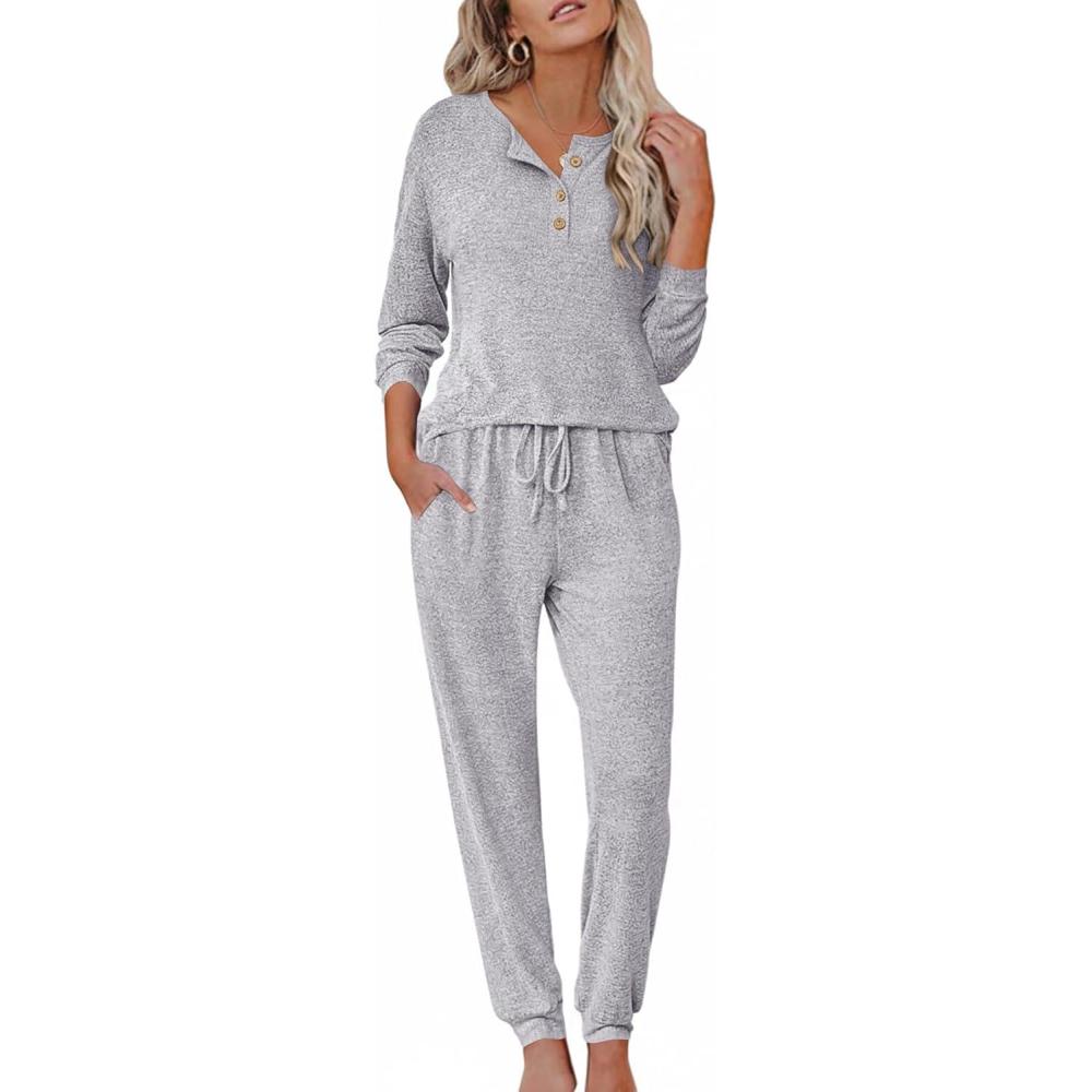 Ekouaer Womens Pajama Sets Long Sleeve Lounge Set 2 Piece Pj Sets for Women Henley Neck Casual Sleepwear Loungewear S-XXL(Light Grey)