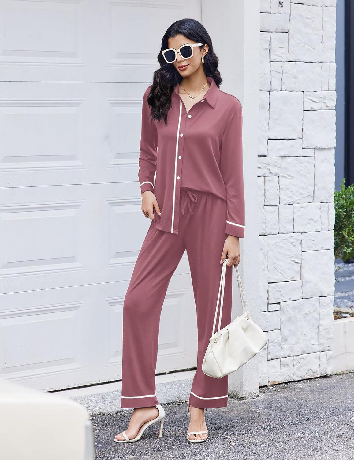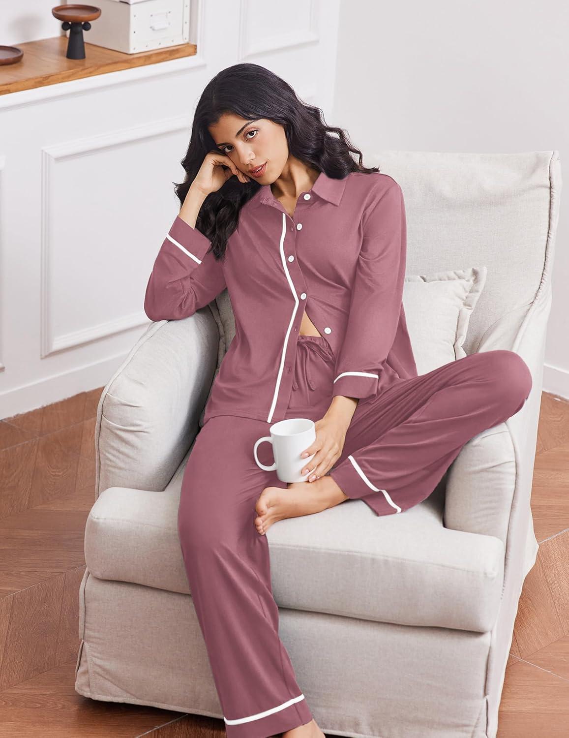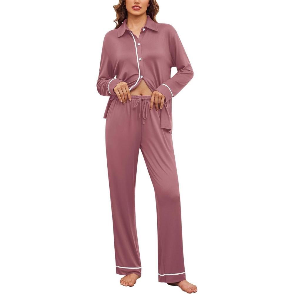 Ekouaer Womens Pajama Sets Long Sleeve Sleepwear Soft Button Down Pjs 2 Piece Loungewear witn Pants S-XXL(Old Rose)