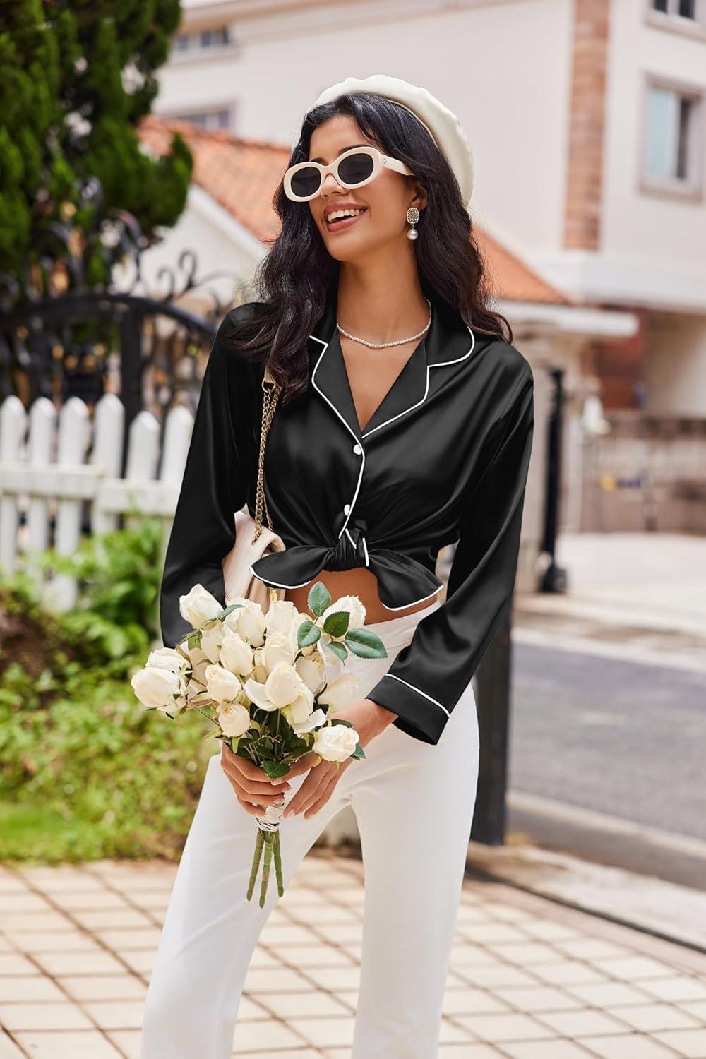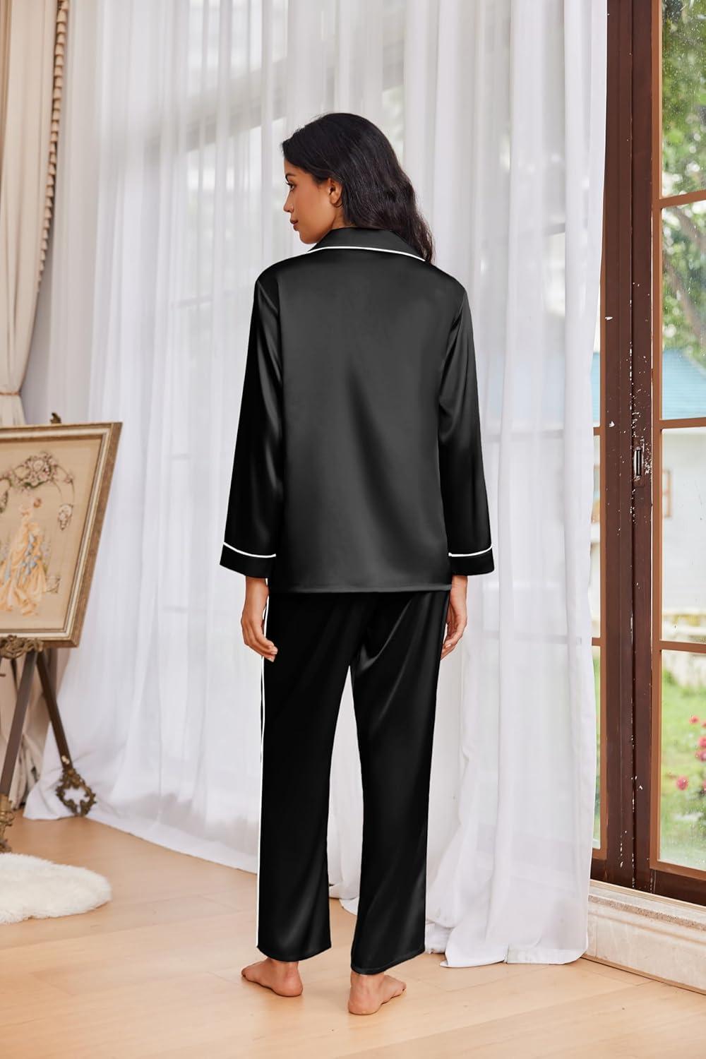 Ekouaer Womens Pajama Sets Satin Silk Pjs Classic Button Down Sleepwear Soft Long Sleeve Lounge Sets(Black)