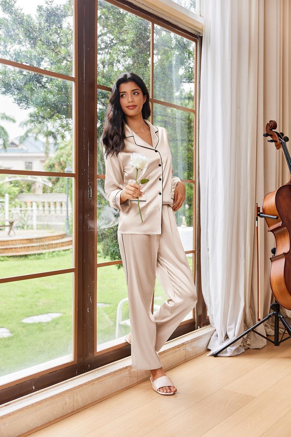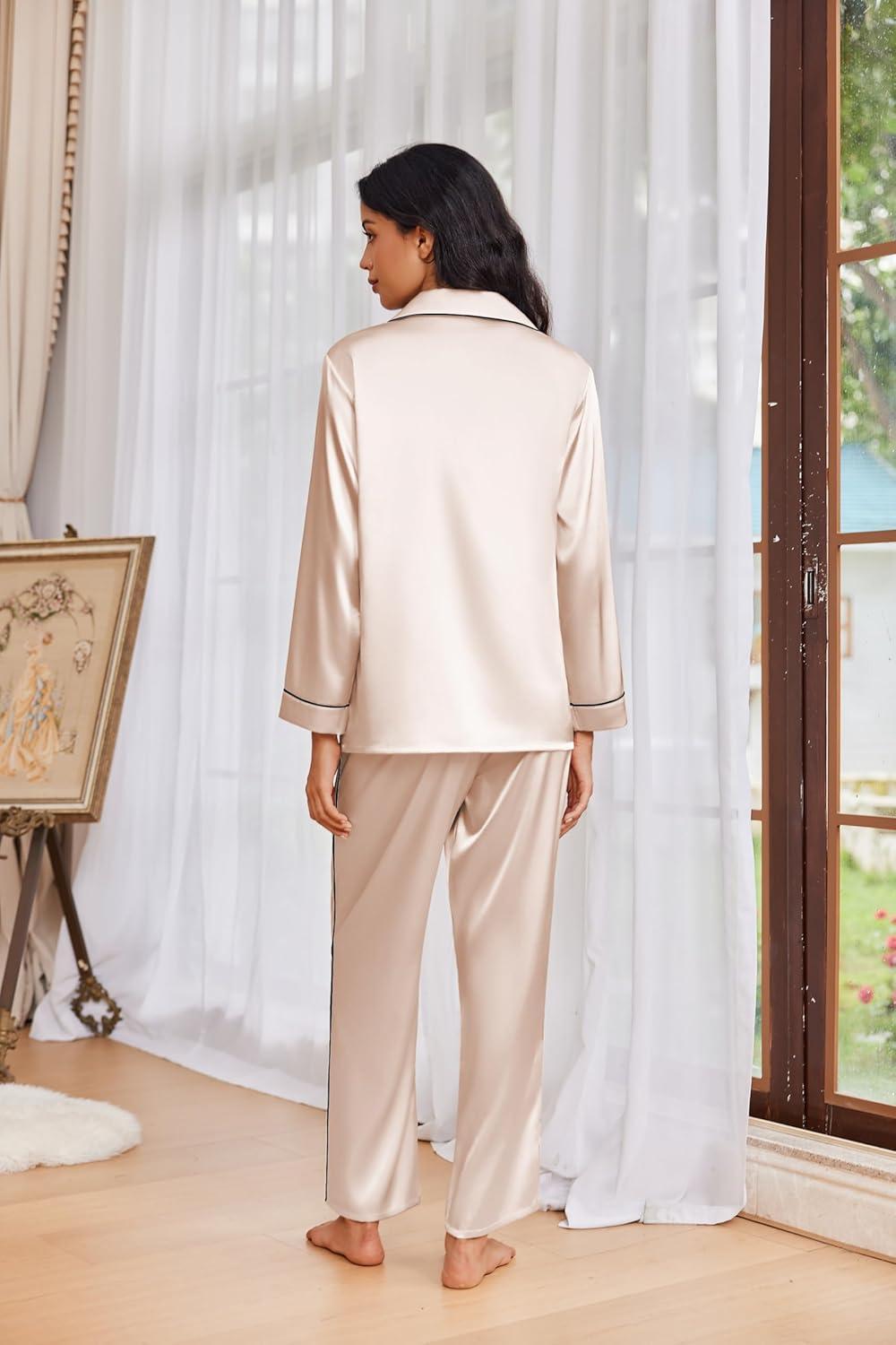 Ekouaer Womens Pajama Sets Satin Silk Pjs Classic Button Down Sleepwear Soft Long Sleeve Lounge Sets(Champagne)