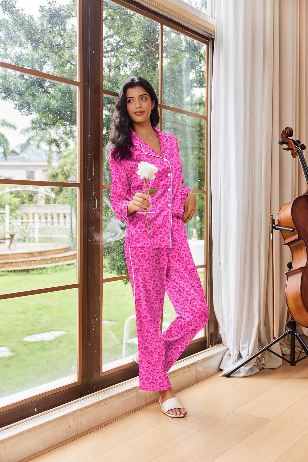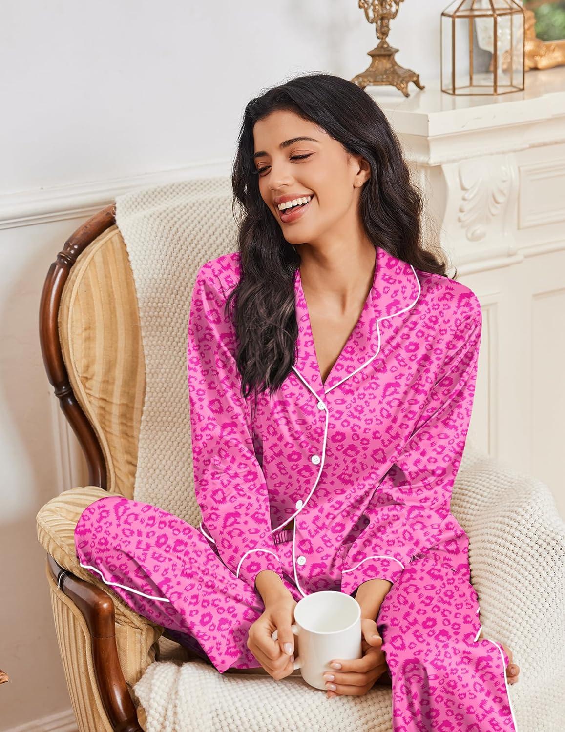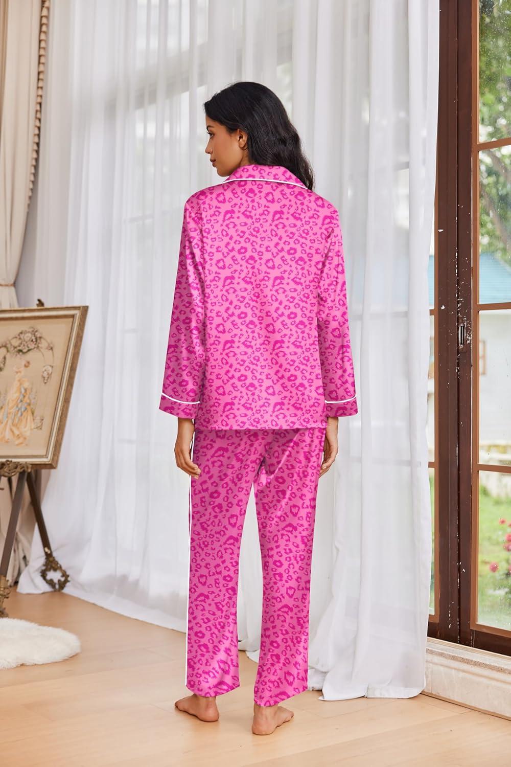 Ekouaer Womens Pajama Sets Satin Silk Pjs Classic Button Down Sleepwear Soft Long Sleeve Lounge Sets(Hot Pink Leopard)