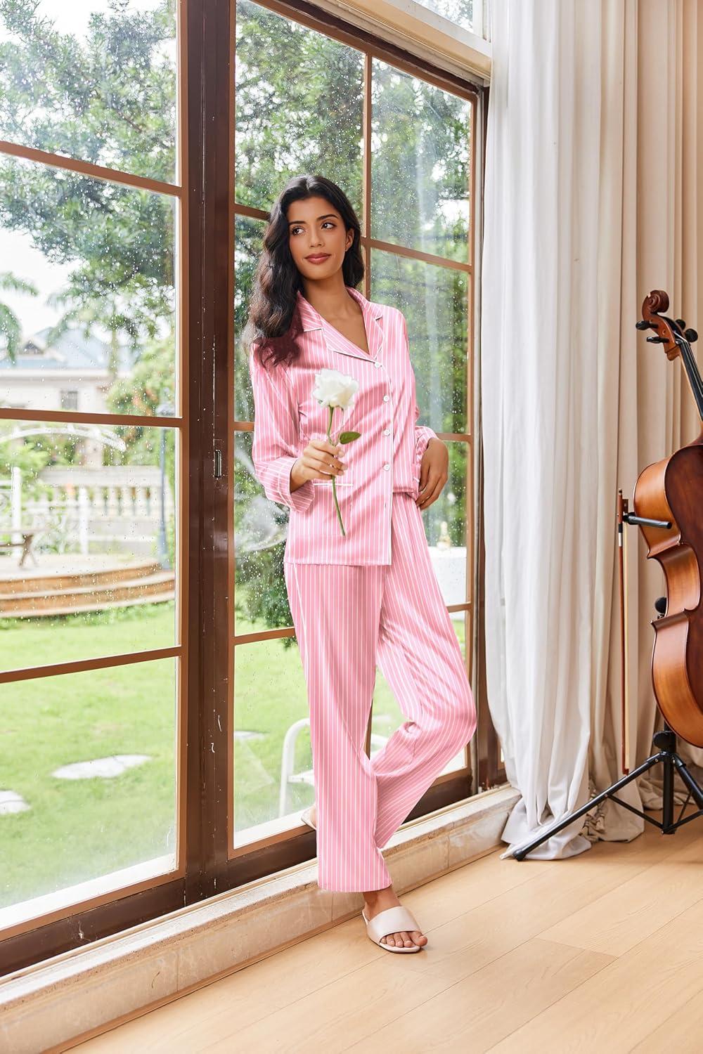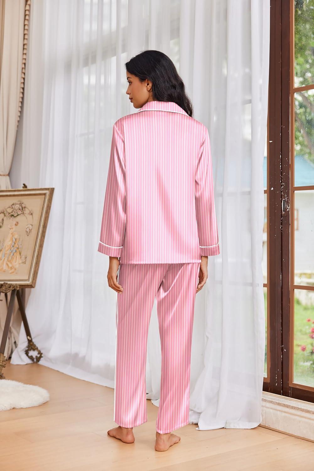 Ekouaer Womens Pajama Sets Satin Silk Pjs Classic Button Down Sleepwear Soft Long Sleeve Lounge Sets(Pink Striped)
