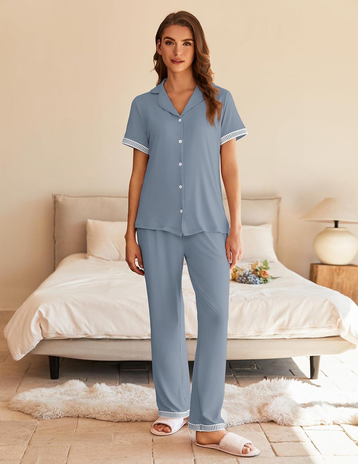 Ekouaer Womens Pajama Sets Short Sleeve Button Up Pjs, Chic Contrast Trim, Long Pants with Pockets,Soft Loungewear Set S-XXL(Blue)