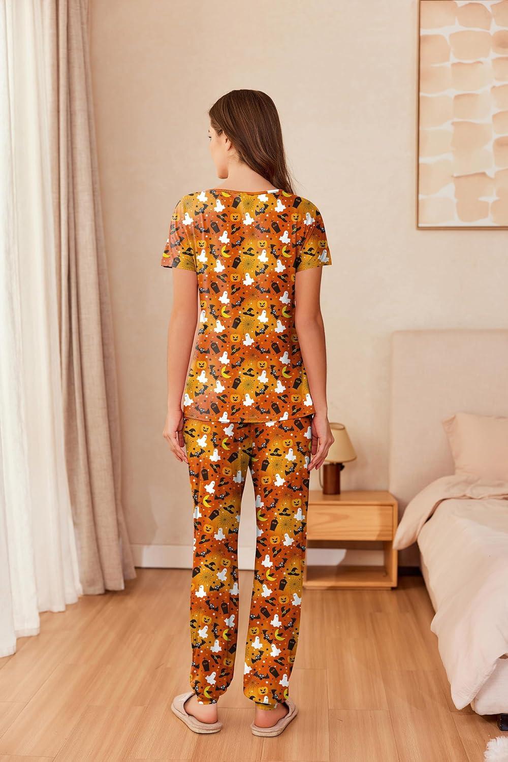 Ekouaer Womens Pajama Sets Short Sleeve Lounge Sets for Women Printed Jogger Pajama Set 2 Piece Pj Sets With Pockets S-XXL(Orange Halloween Pattern)