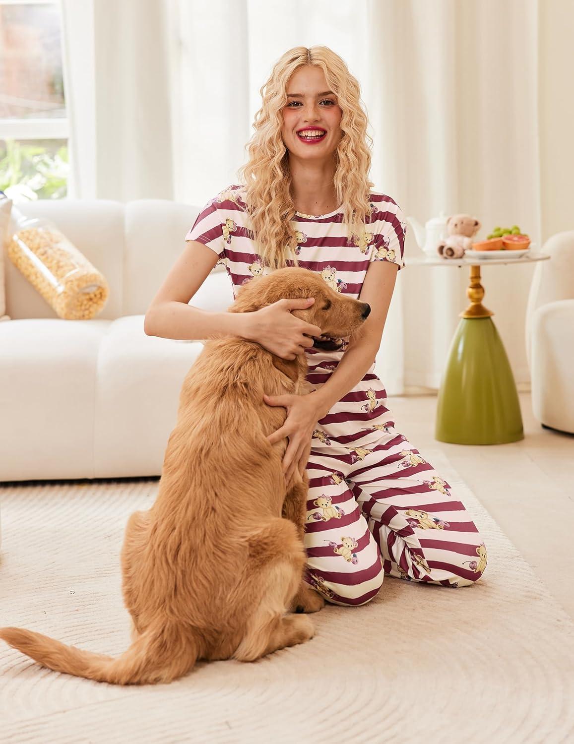 Ekouaer Womens Pajama Sets Short Sleeve Lounge Sets for Women Printed Jogger Pajama Set 2 Piece Pj Sets With Pockets S-XXL(Striped Teddy Bear)