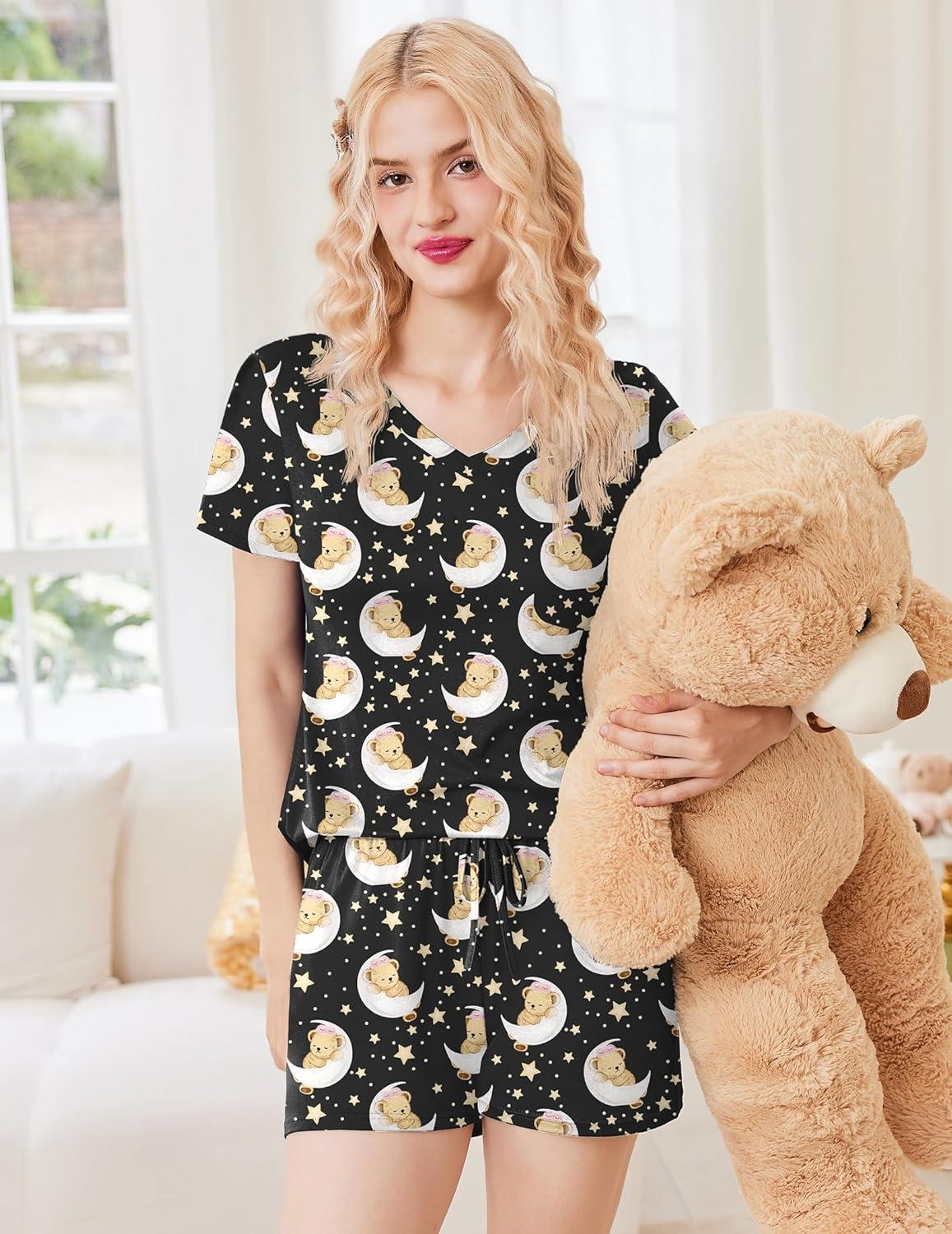 Ekouaer Womens Pajama Sets Short Sleeve Pajamas for Women Sets Soft Lounge Sets Casual V Neck Sleepwear PJS(Black Teddy)
