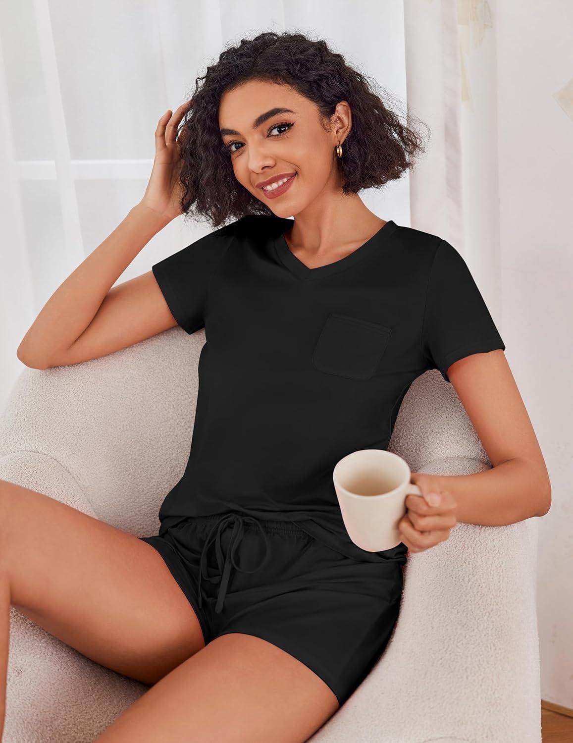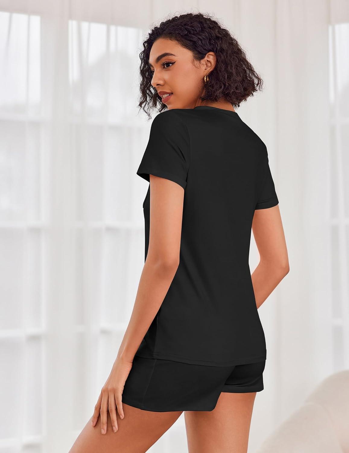 Ekouaer Womens Pajama Sets Short Sleeve Pajamas for Women Sets Soft Lounge Sets Casual V Neck Sleepwear PJS(Black)