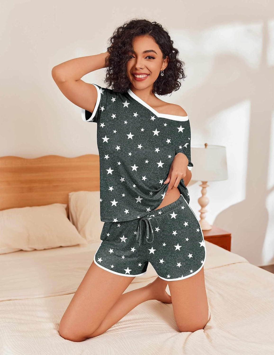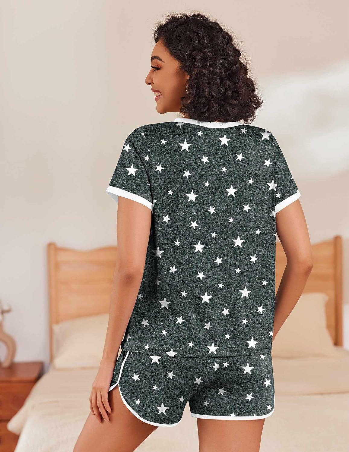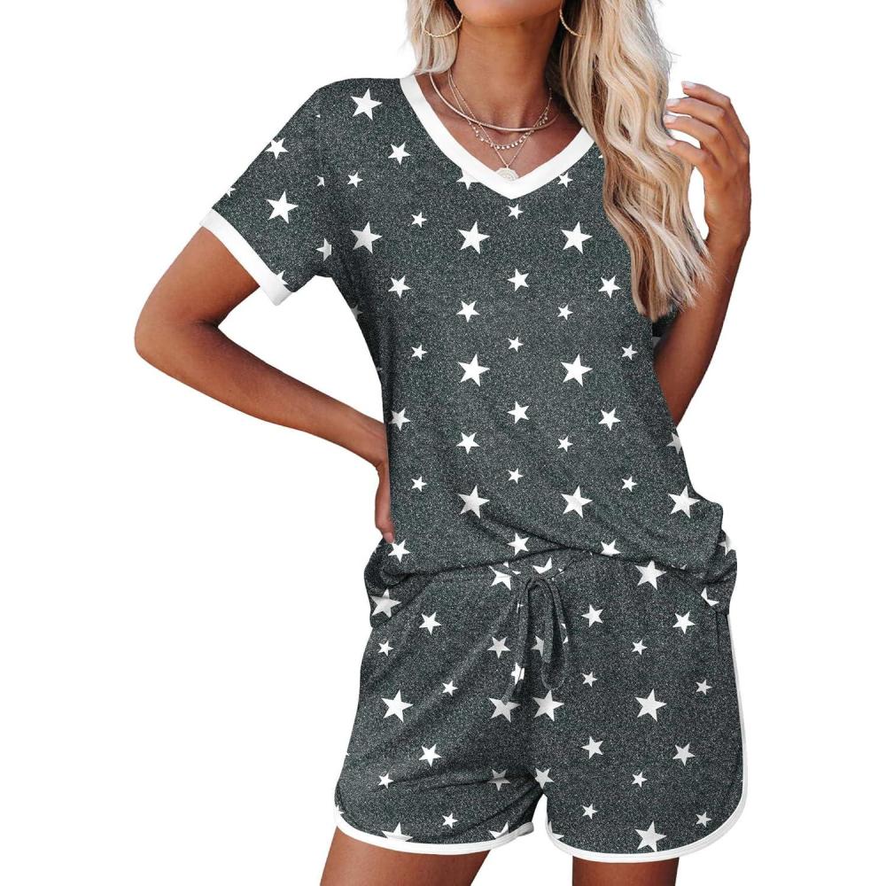 Ekouaer Womens Pajama Short Sets Lounge Sets for Women 2 Piece Soft Pjs Set Casual V Neck Sleepwear with Pockets(Stars-dark Grey)