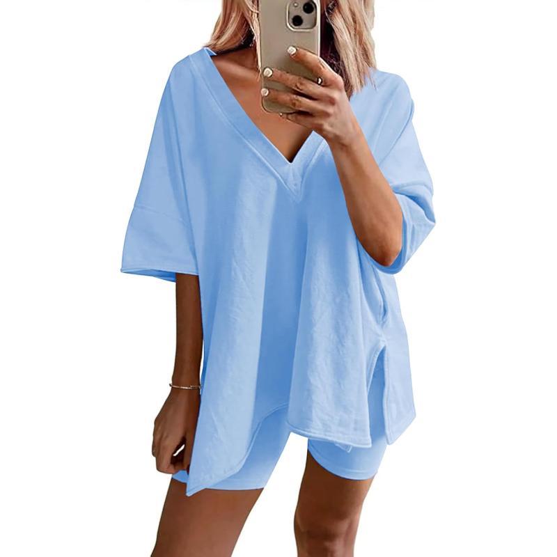 Ekouaer Womens Pajamas 2 Piece Lounge Sets Oversized V Neck TShirts Tops Biker Shorts Set Workout Reversible Tracksuit SXXLLight Blue
