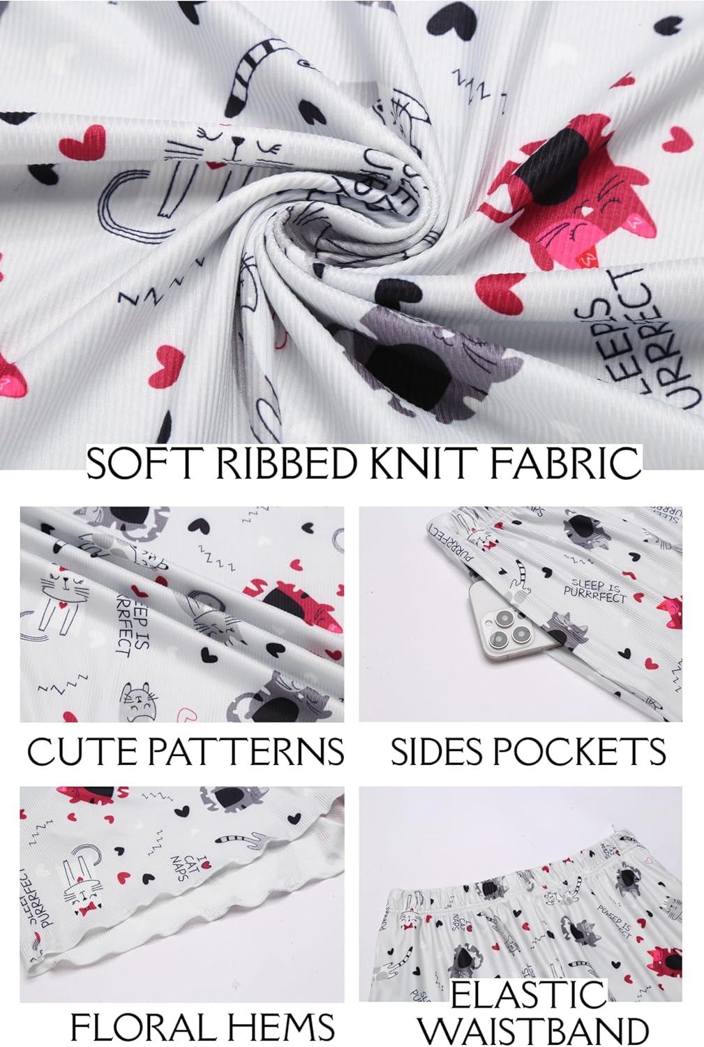 Ekouaer Womens Pajamas 2 Piece Ribbed Knit Pjs Colorful Pattern Sleep Set Short Sleeve Pajamas Set Casual Lounge Sets(Pink Cats)