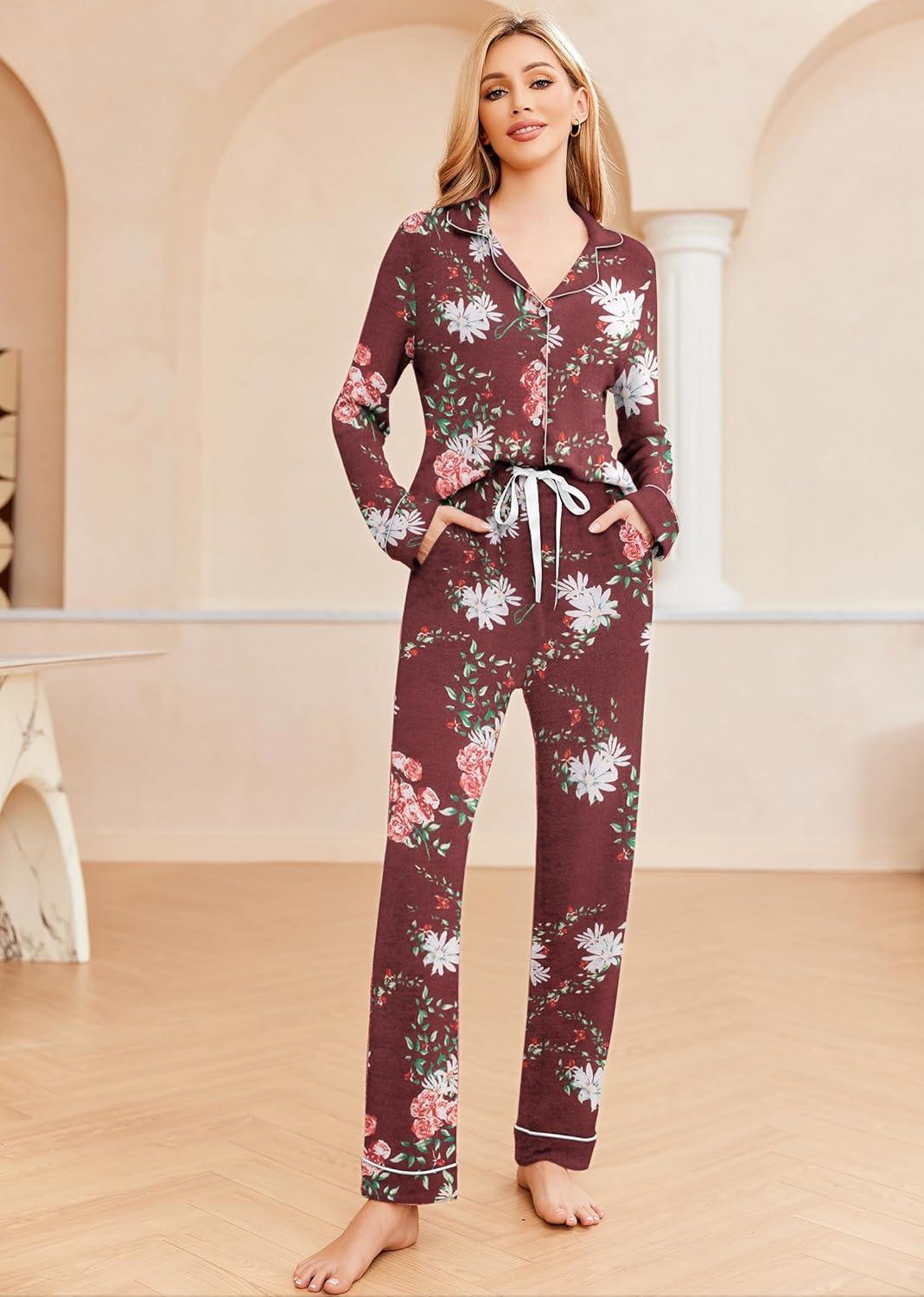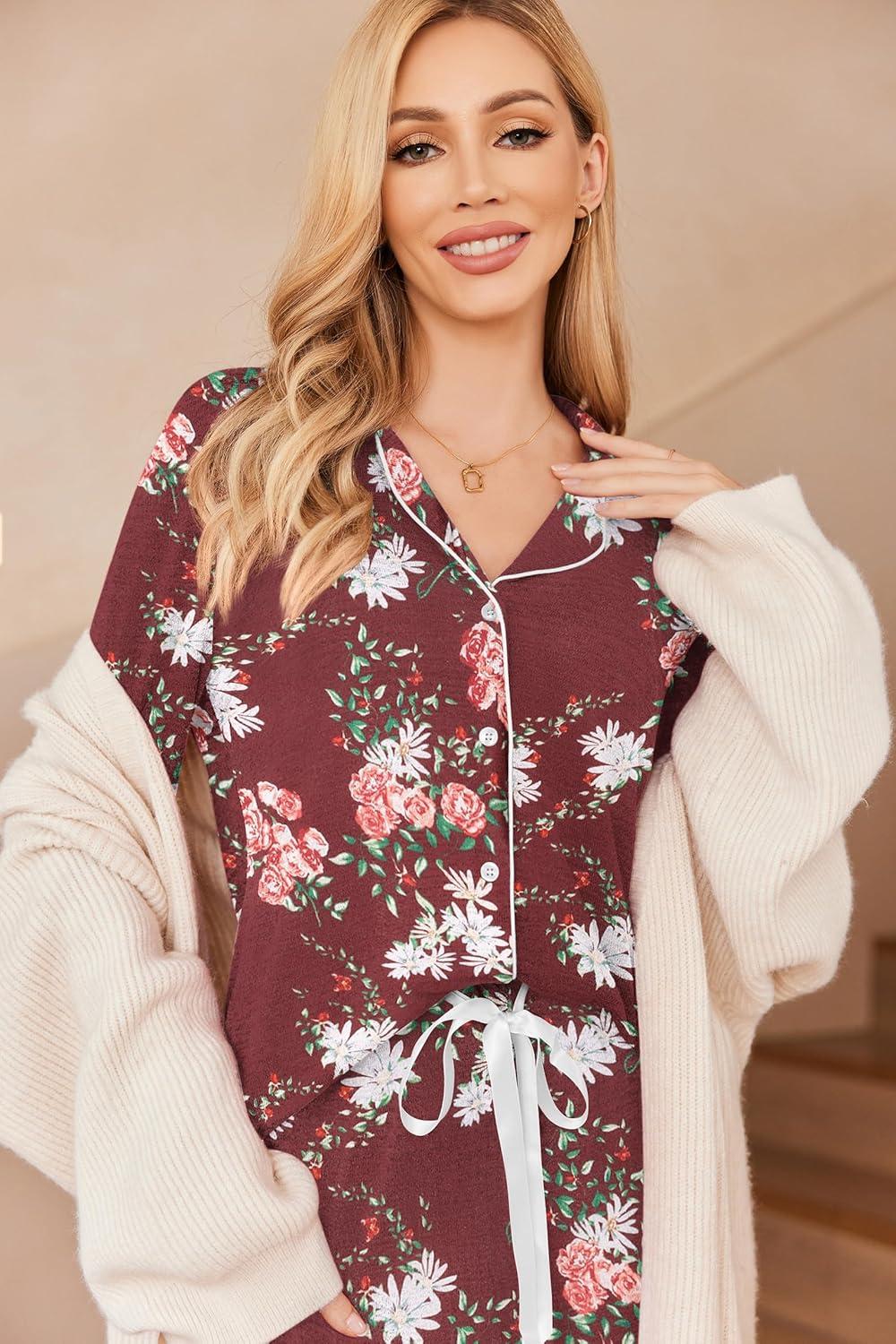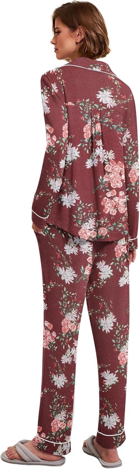 Ekouaer Women's Pajamas Long Sleeve Sleepwear Casual Button Down Loungewear Soft Pjs Set S-XXL(Red Floral)