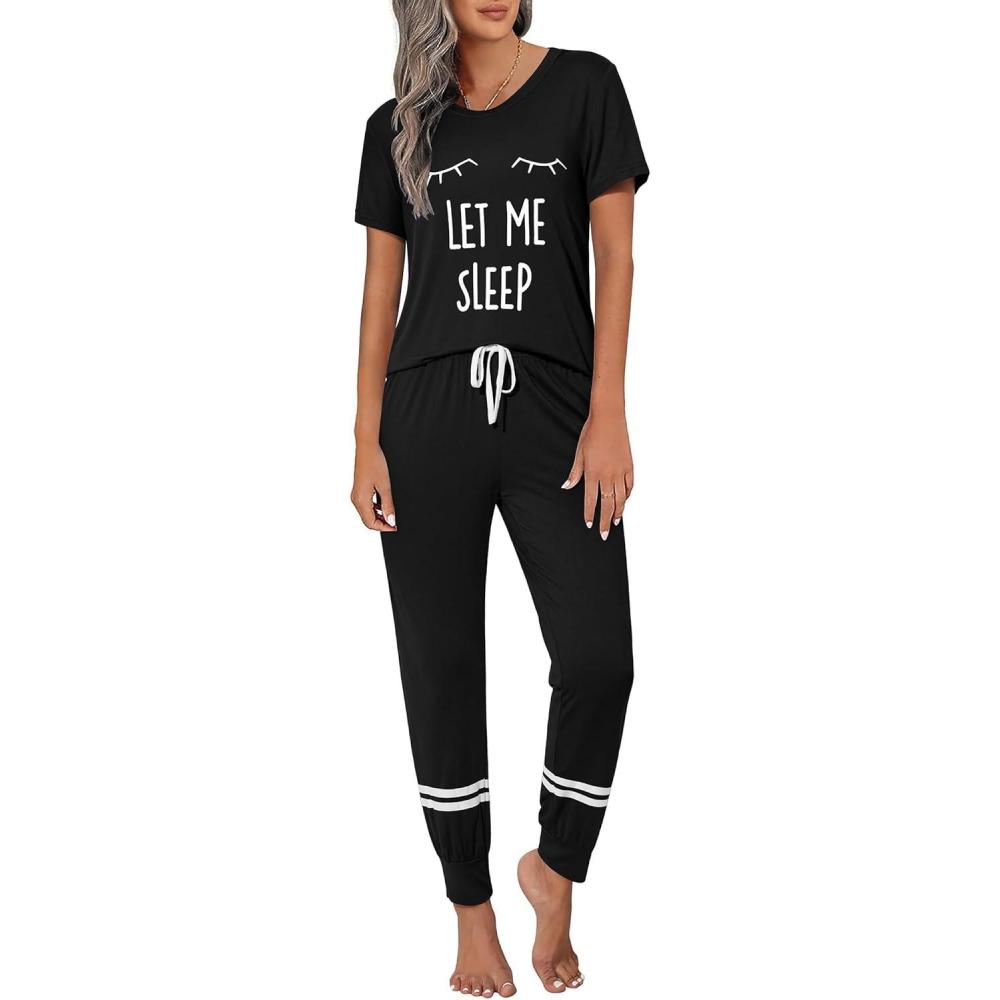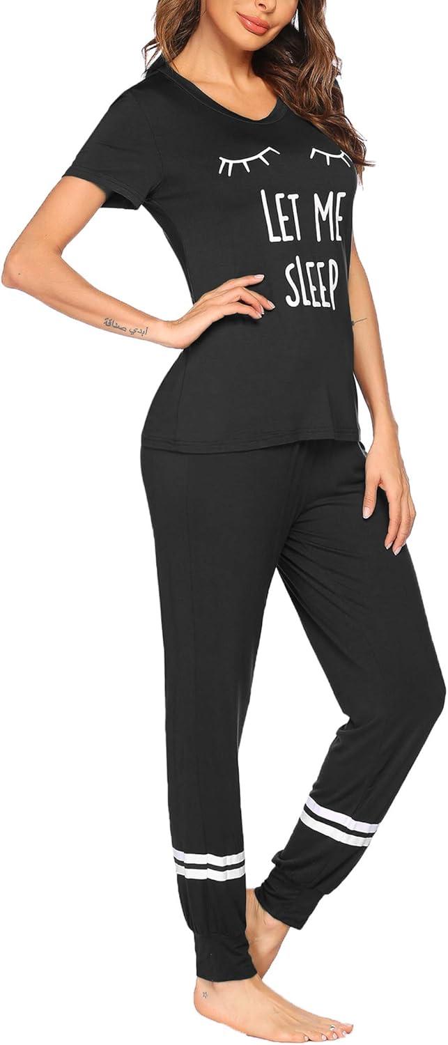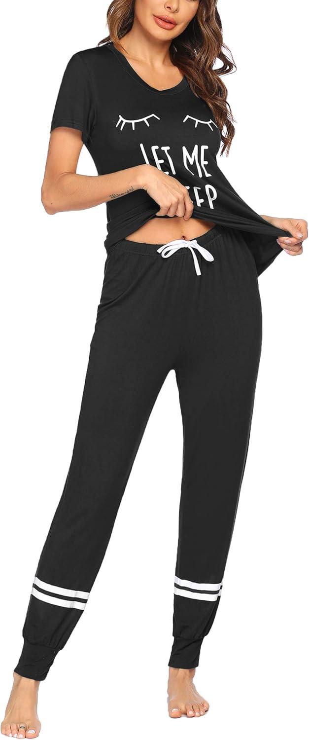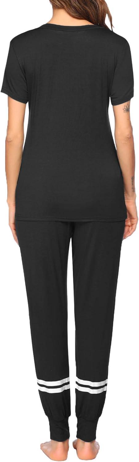 Ekouaer Womens Pajamas Set 2 Piece Lounge Pj Set Short Sleeve Sleepwear Tops with Joggers Pants Loungewear Print Nightwear(Black)