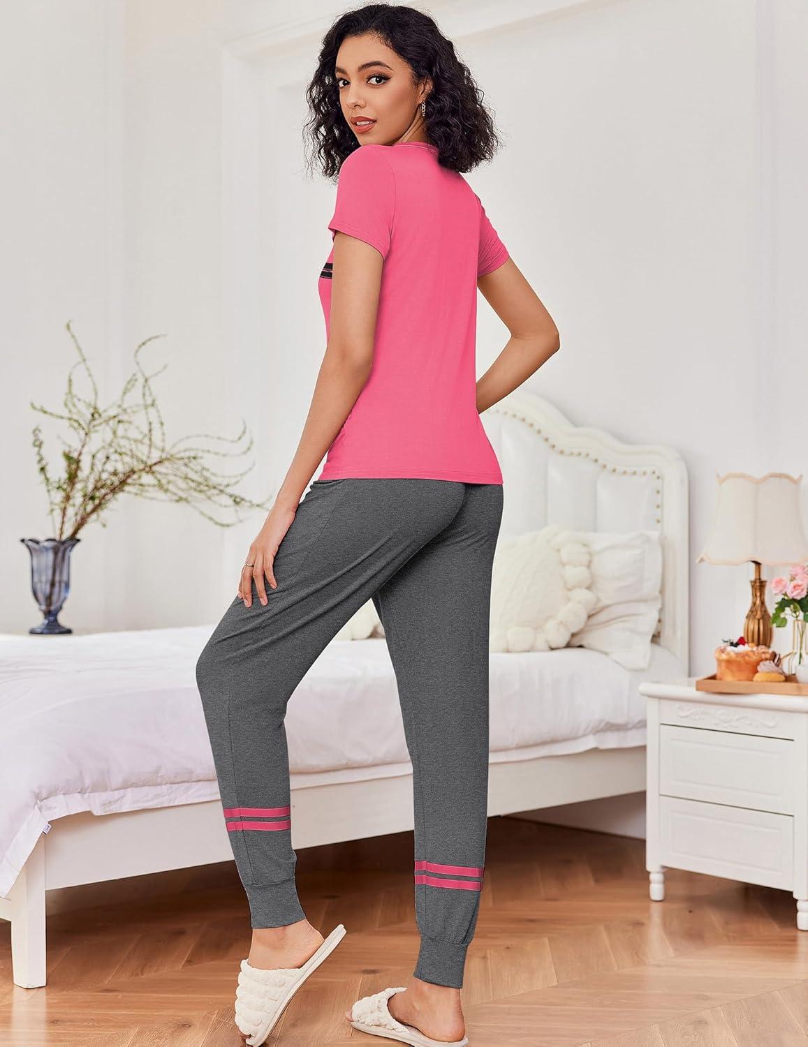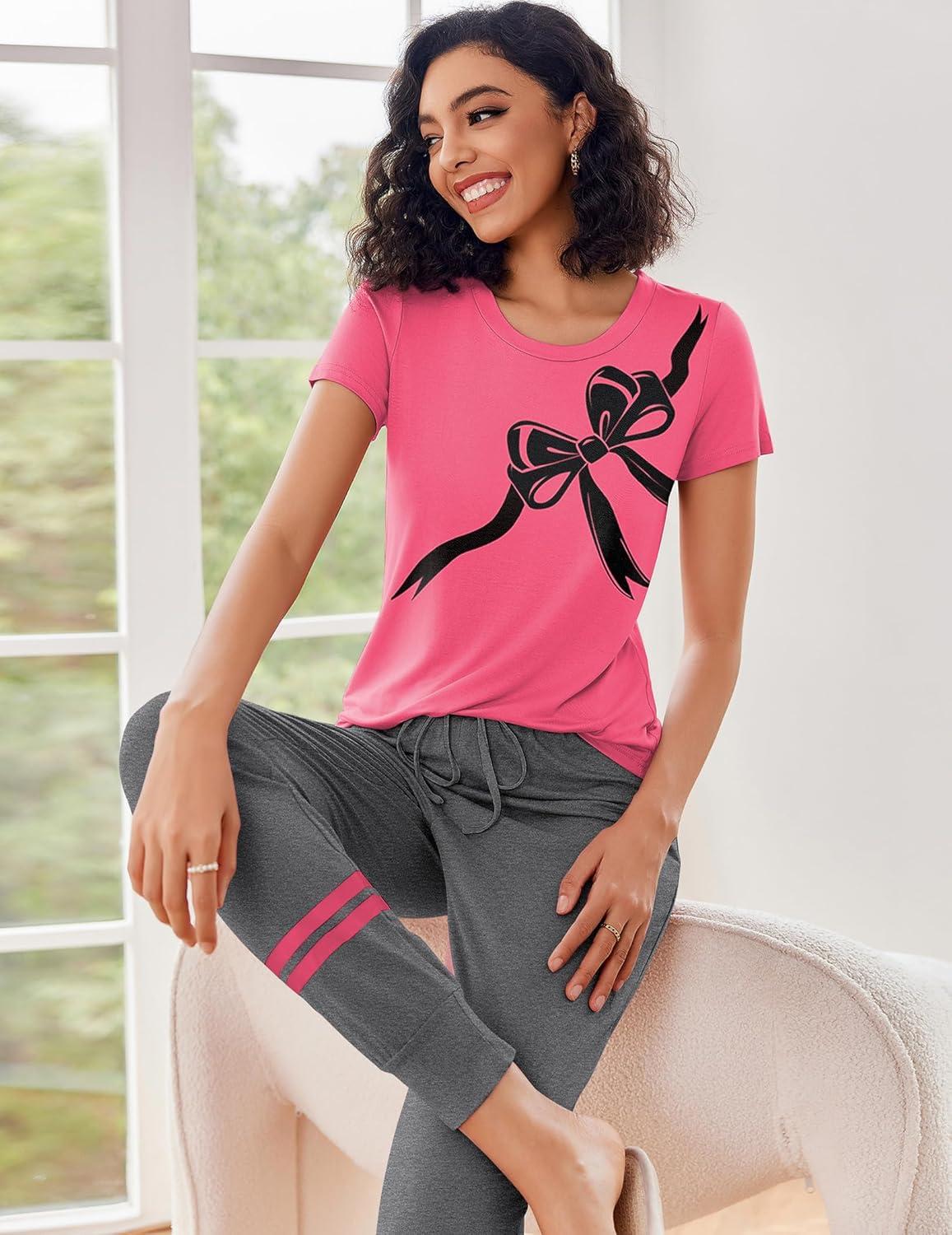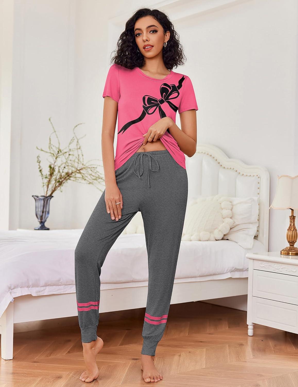 Ekouaer Womens Pajamas Set 2 Piece Lounge Pj Set Short Sleeve Sleepwear Tops with Joggers Pants Loungewear Print Nightwear(Dark Pink)